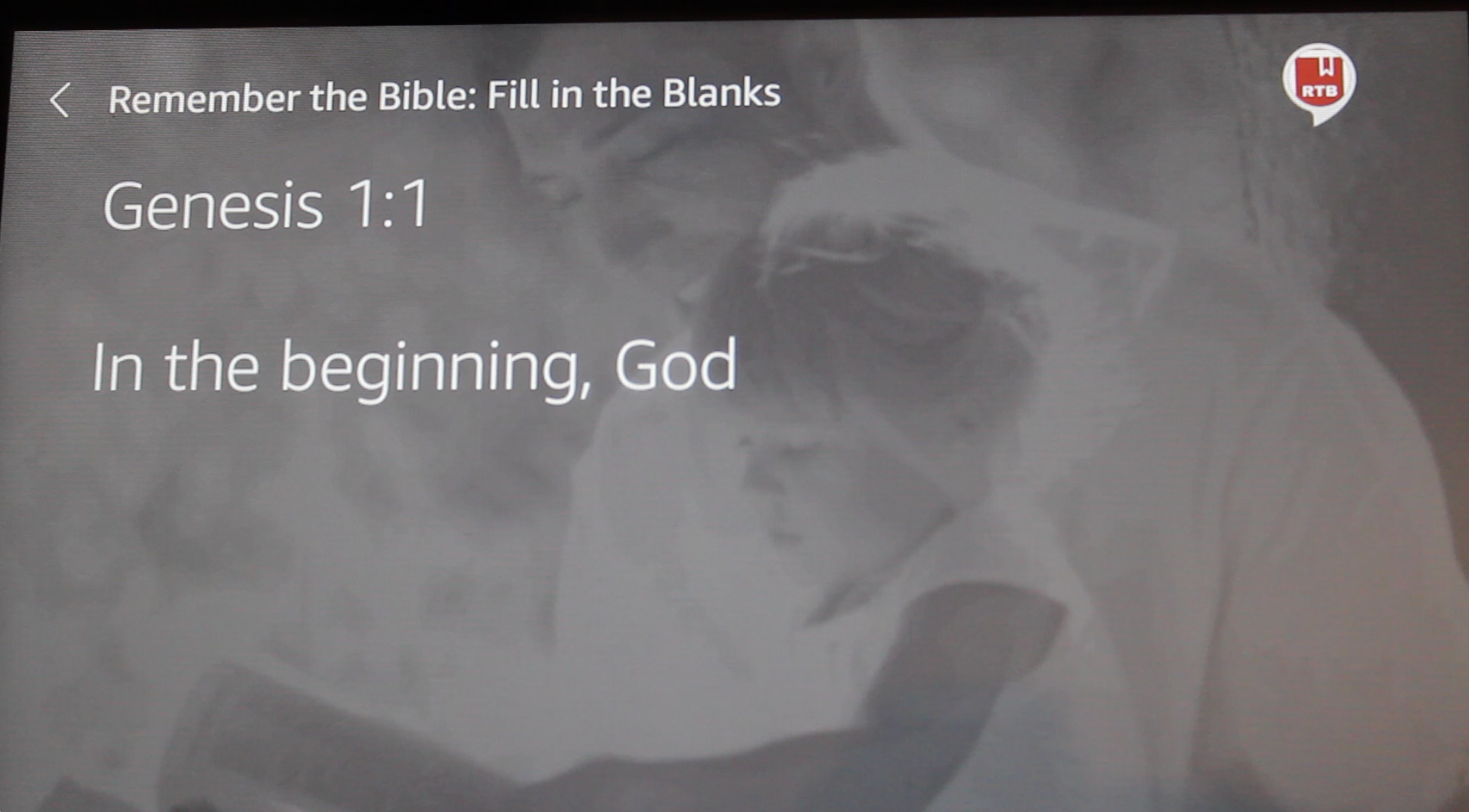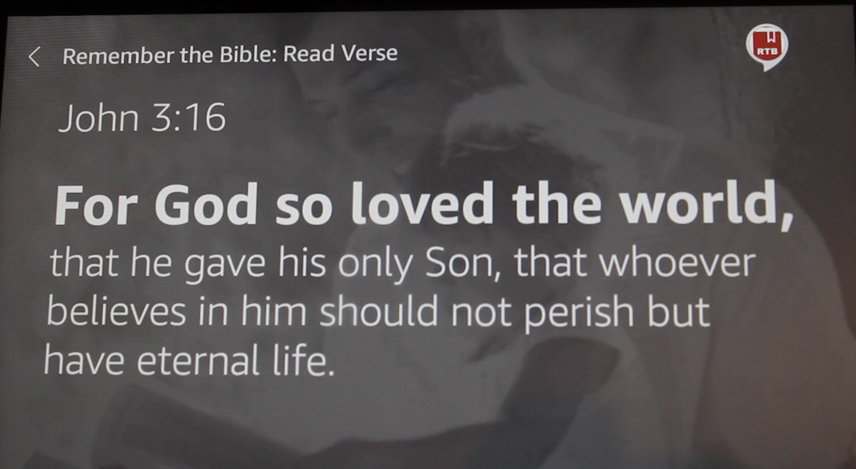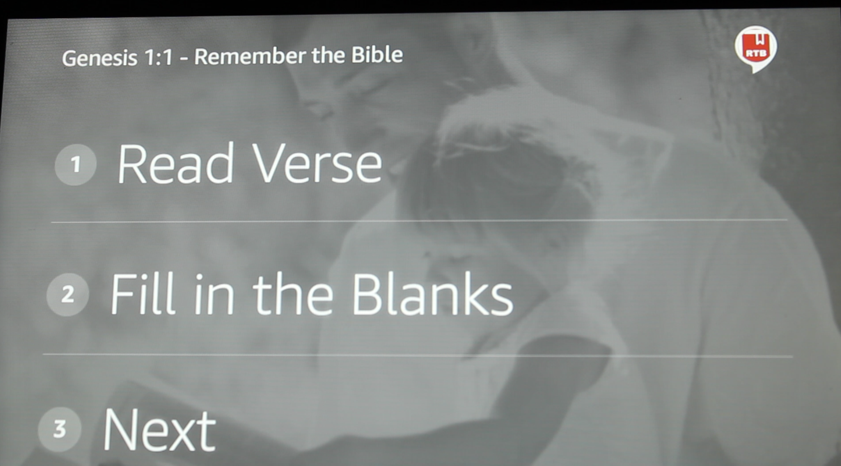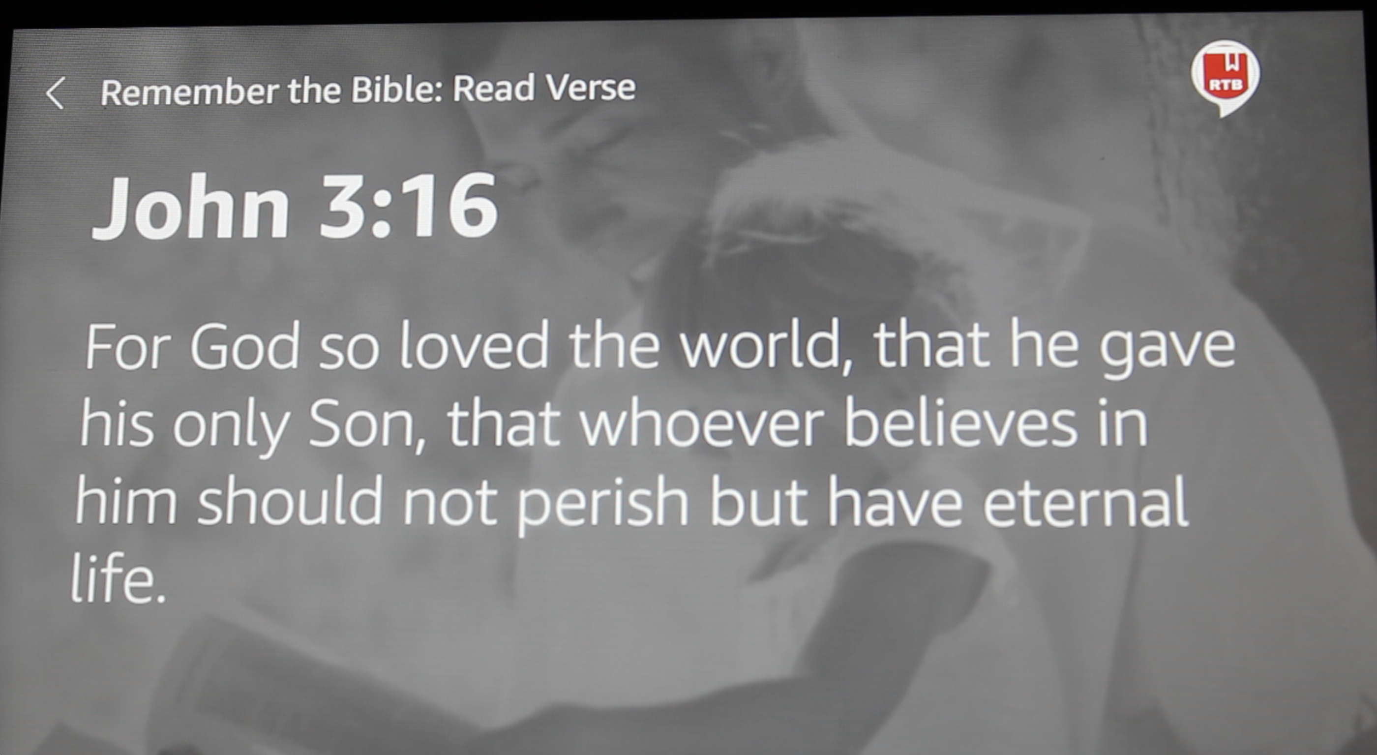 This skill has a set of scriptures selected specifically for kids. When you open the skill, you start with Genesis 1:1 but can go to other scriptures. For any scripture, you can have Alexa read it to you, and then she will prompt you to repeat each phrase back to her. Once you feel you have the verse memorized, Alexa can start saying the verse and then prompt you to say the next words. The words that you are prompted to speak are different each time, so you will be prompted for different parts of the verse.