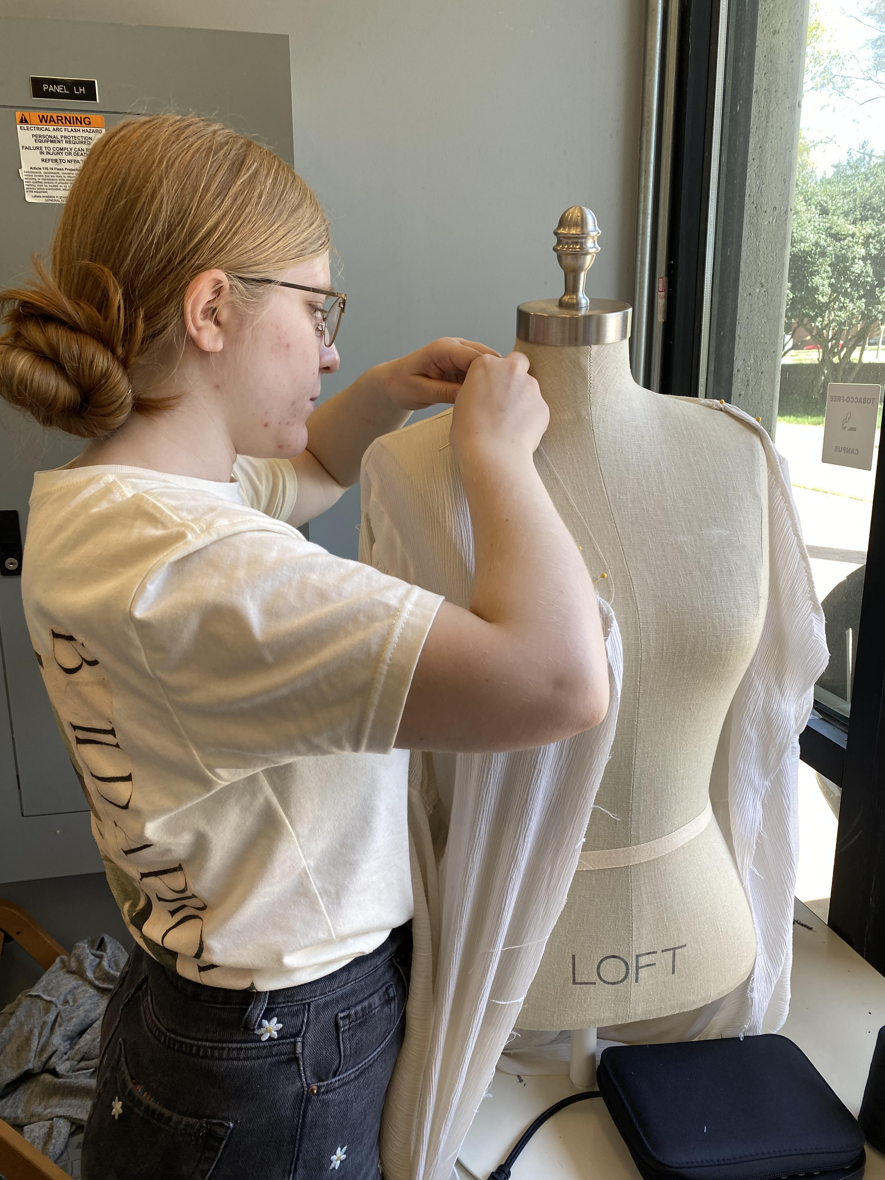 We used a thin ivory cotton woven voile as the dress' fabric. To begin, we sketched out ideas and established what kind of look we wanted. Next, we made a toile, a mockup, to get the correct proportions of the pattern pieces. The process involved pinning and sewing the toile and continuously made minor adjustments to ensure the dress fitted the body. Finally, we cut the toile apart into the corresponding pattern pieces. The pattern was then laid out on the final fabric, cut out, then sewn together with a Brother ST371HD sewing machine.