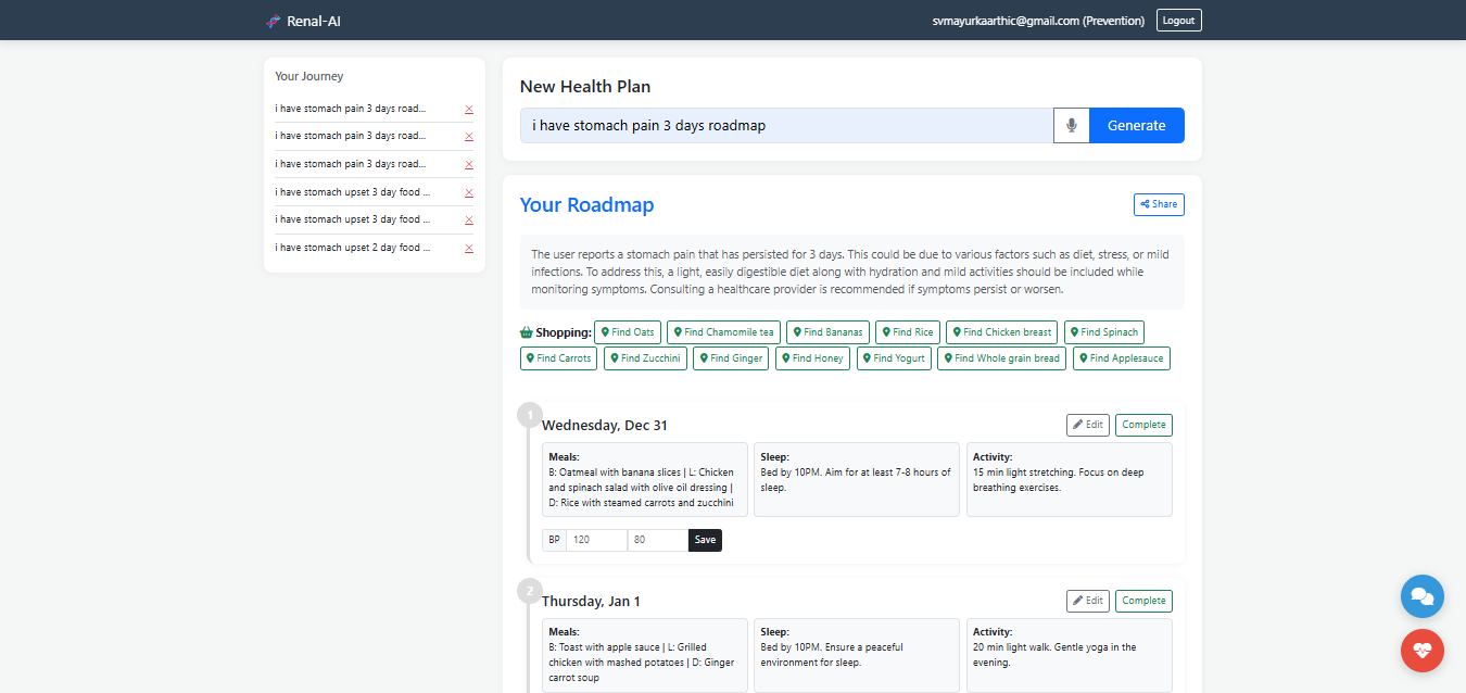Renal AI is a lightweight wellness assistant designed to help users plan a simple 3-day healing routine focused on diet, rest, and physical activity. Instead of overwhelming users with medical jargon or complex data, the platform provides gentle, practical recommendations tailored to different health states. Users can explore meal suggestions, light activity routines, and rest guidance through a clean and calming interface designed for everyday usability.