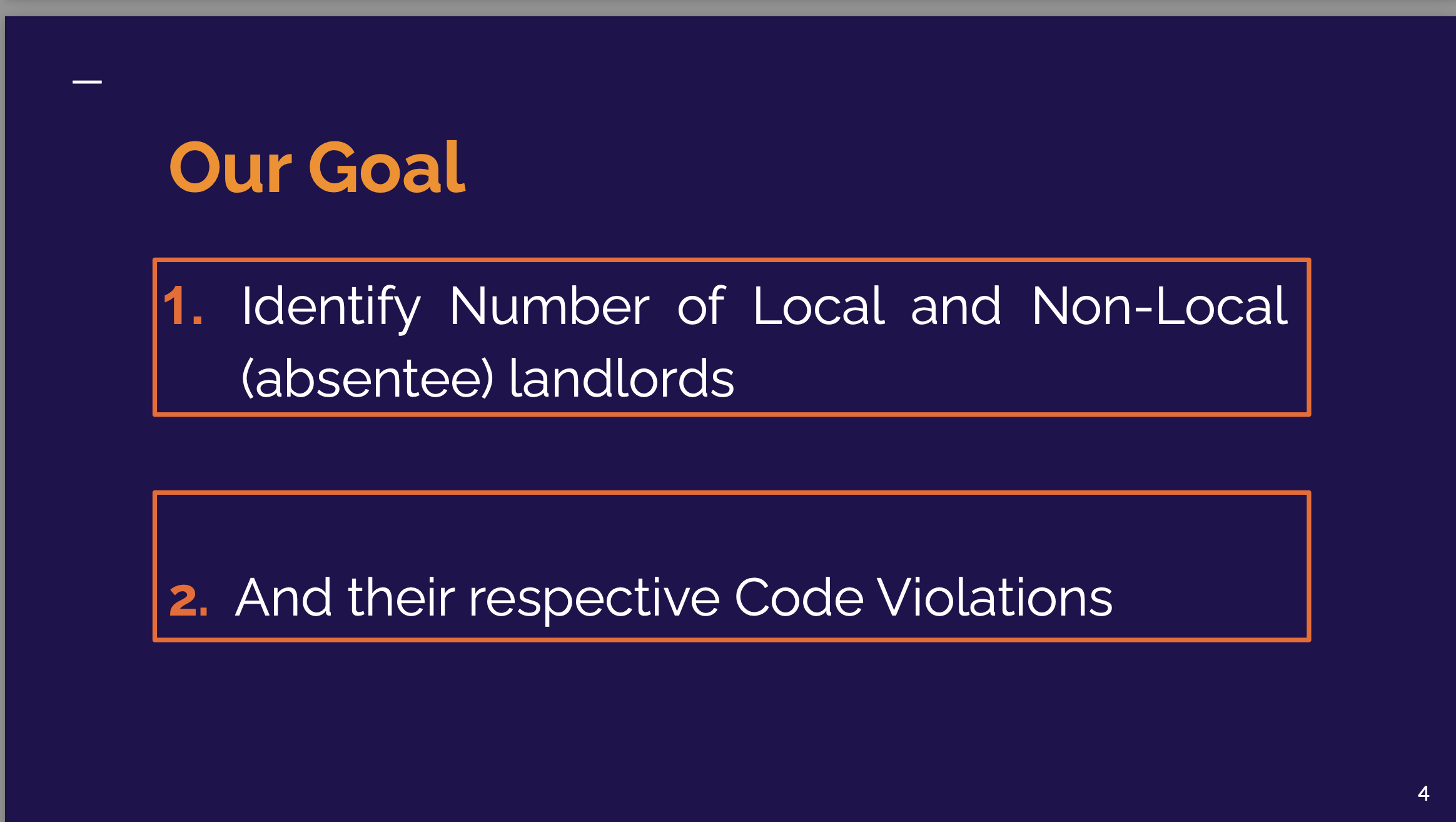 Our project began with extensive research into the Syracuse Housing Strategy 2024, which identified absentee landlords as a threat to tenant well-being. However, the strategy lacked comprehensive data on the number and impact of these landlords. To address this gap, we embarked on a detailed analysis of the rental properties in Syracuse. We collected data on approximately 11,200 actively rented properties, categorizing them by the location of their owners—local residents, landlords from within New York State, and absentee landlords living out of state or even out of the country.