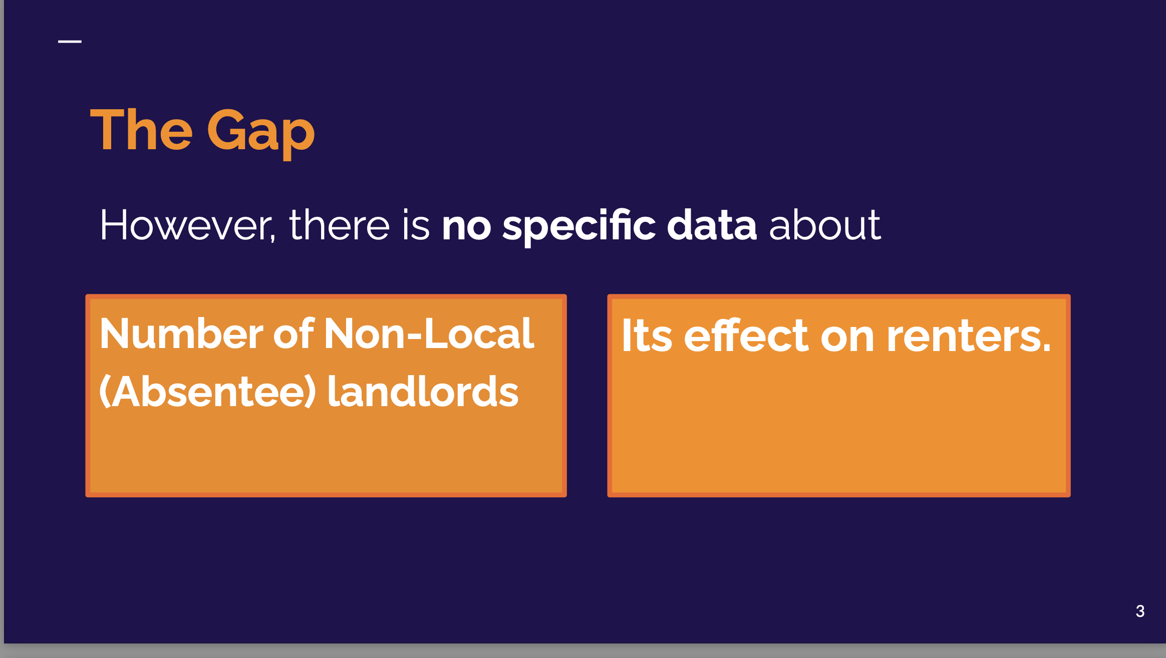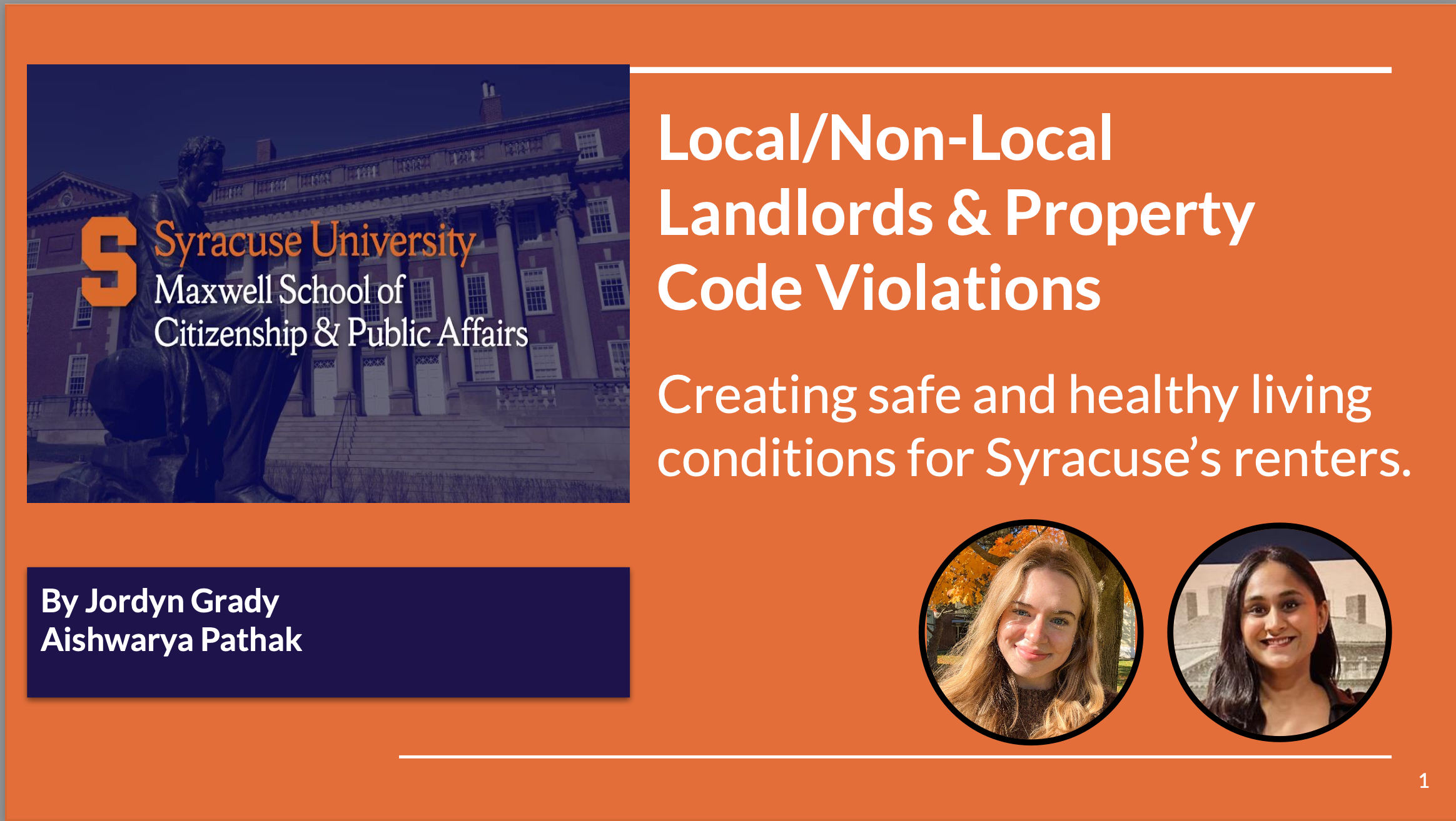 As an international student from New Delhi, India, my journey in Syracuse has been both enriching and challenging. My experience as a renter, particularly dealing with a leaking sink that took weeks to repair, opened my eyes to the critical issues faced by tenants—especially those affected by absentee landlords. The frustration of waiting for repairs and the feeling of being unheard ignited a passion within us to advocate for better housing conditions in Syracuse. We became acutely aware of how an absentee landlord’s negligence can significantly diminish a renter’s quality of life, prompting us to seek out data that could inform and improve local housing policies - Aishwarya.