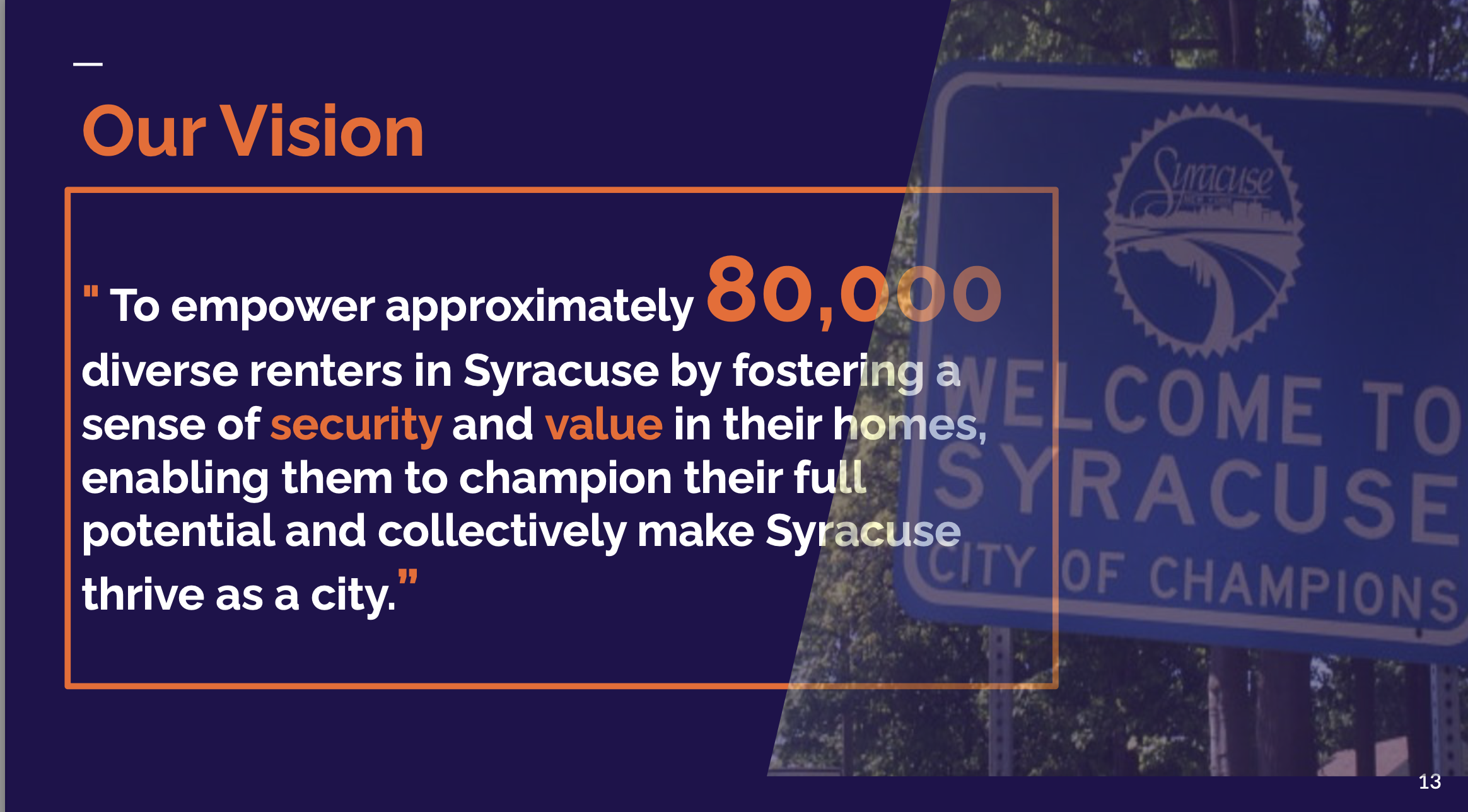Born and raised in Syracuse, I am deeply attached to my city. As a renter myself, I have seen first hand how code violations and poor living conditions degrade quality of living for Syracuse residents. Landlords that fulfill their responsibilities and upkeep their properties have a positive impact on both renters and members of the community. I love my city and the people who live within it. To cultivate Syracuse, it's imperative we live in healthy and safe environments.