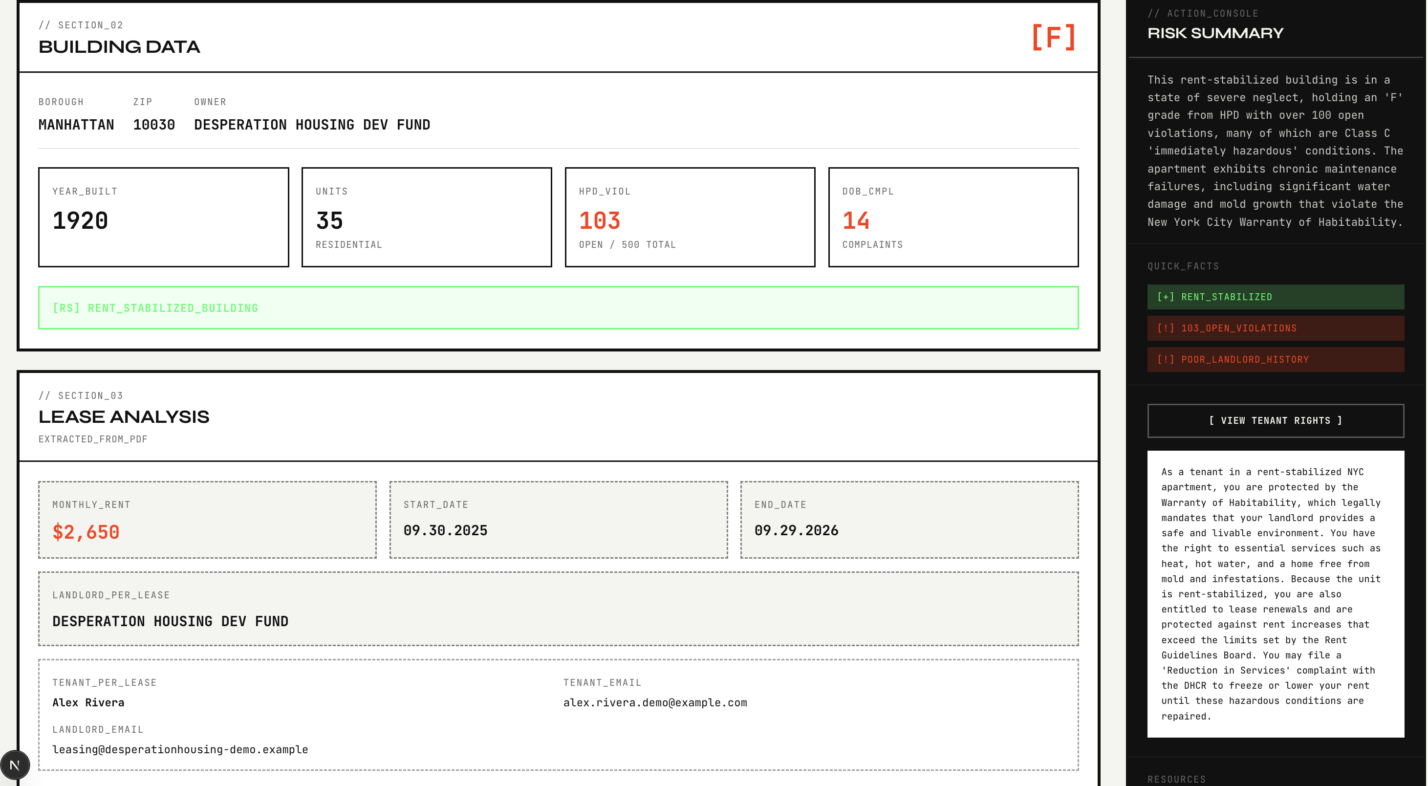 - AI-generated narrative sections for summary, red flags, tenant rights, and email output
