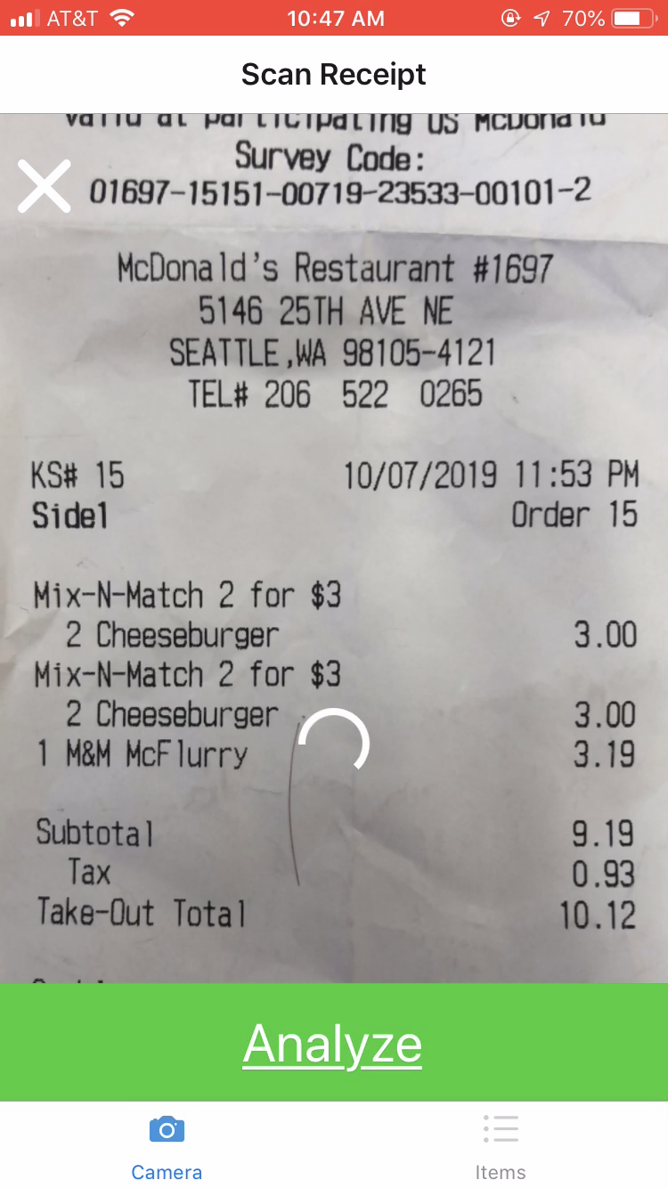 The receipts are parsed using Google Cloud Vision, the database is hosted on Firebase, and React Native was used to build the mobile app.