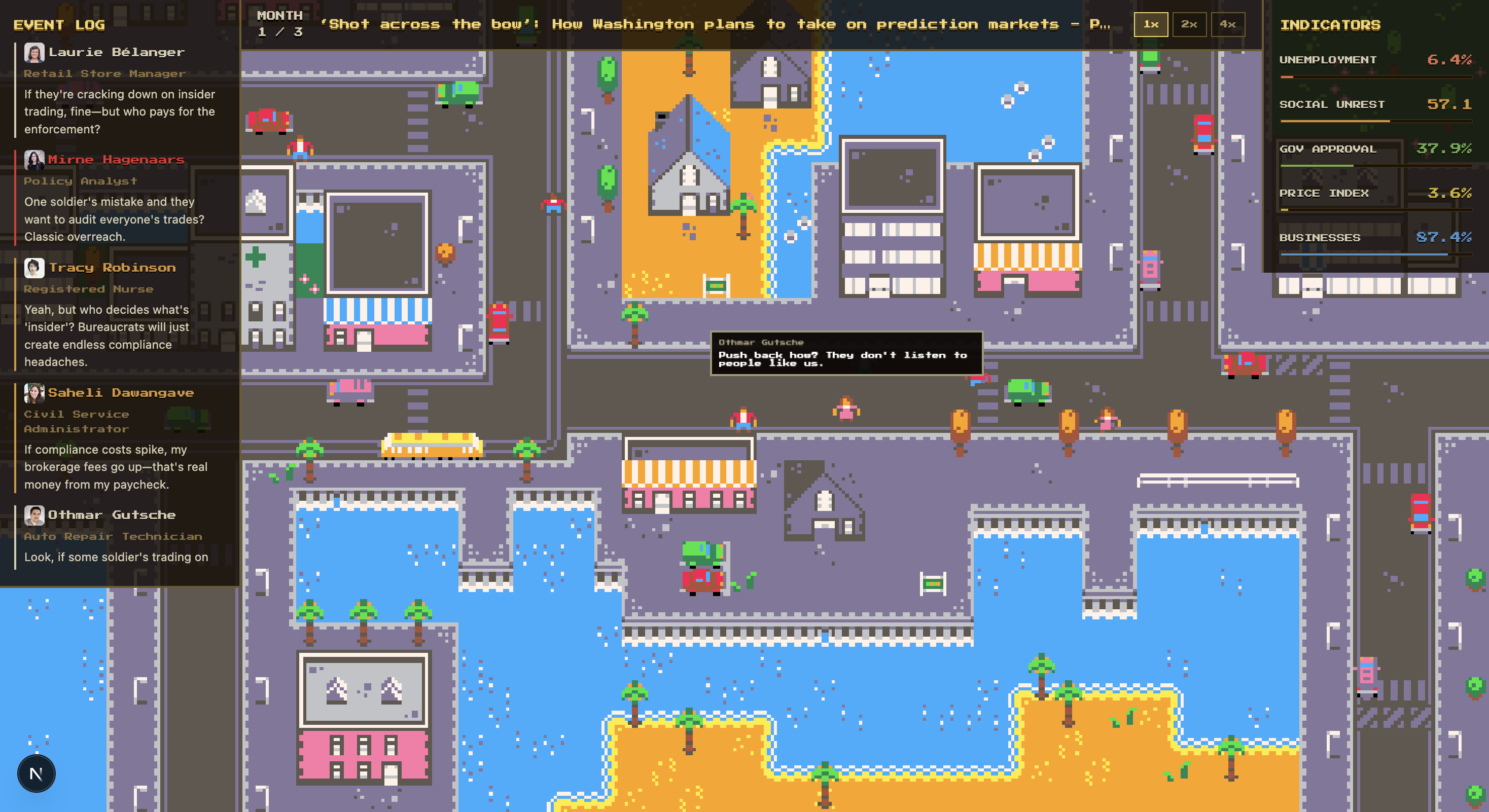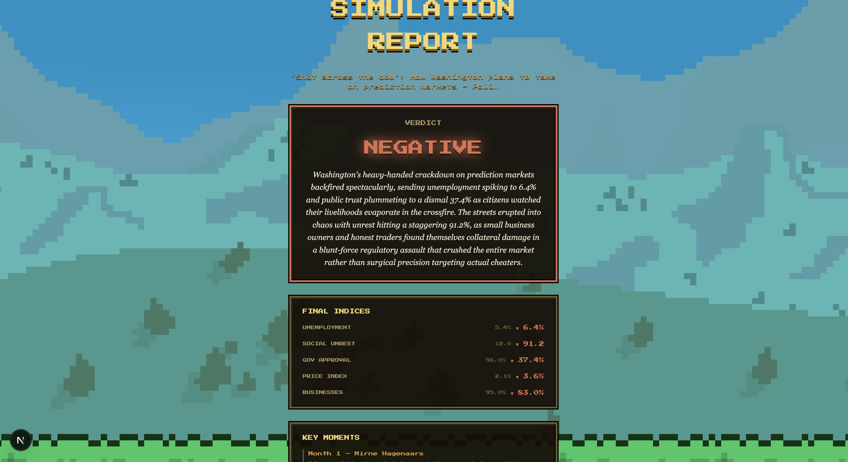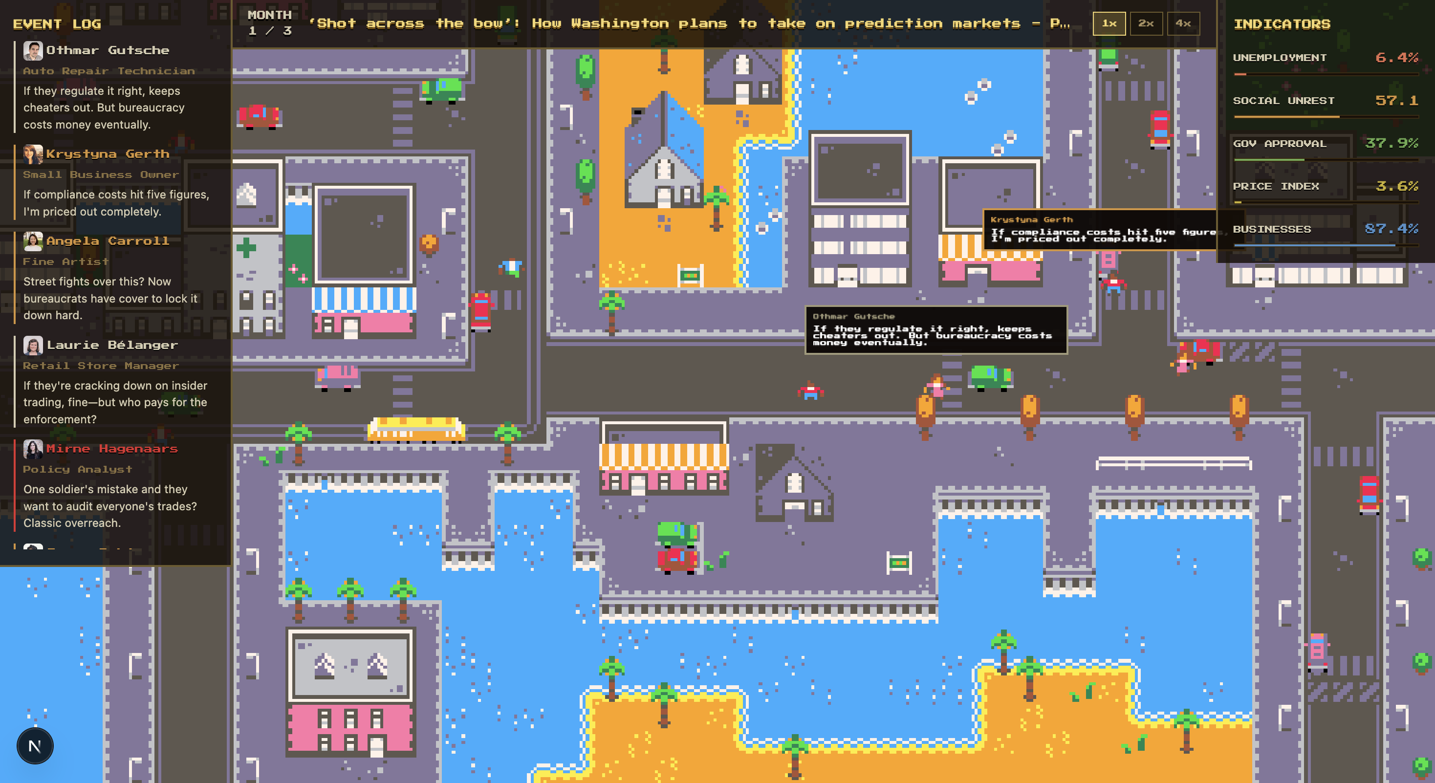 N AI citizens, each with a real randomuser.me identity, a different economic role, and their own political leaning, react to that policy over simulated months while five economic indicators update in real time: