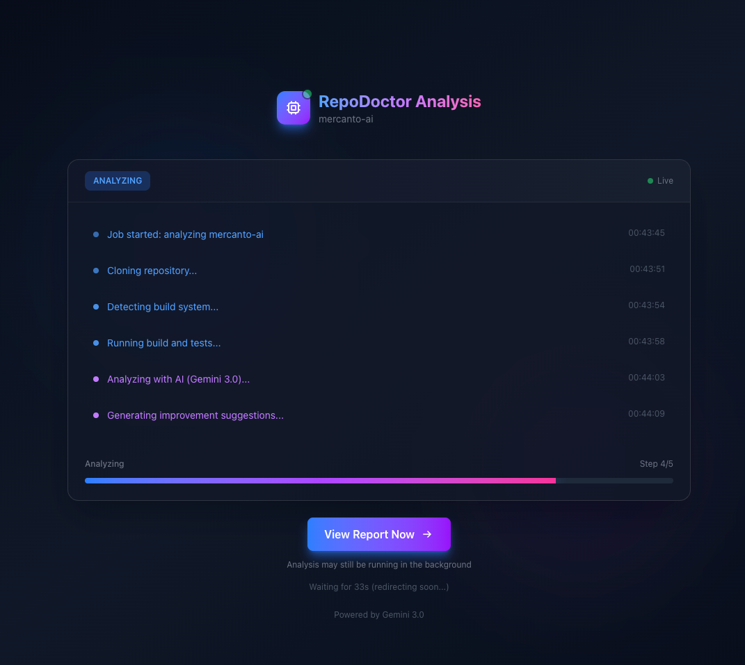 RepoDoctor is an autonomous build-fixing agent powered by Gemini 3. You submit a GitHub repo URL or upload a ZIP, and it:
