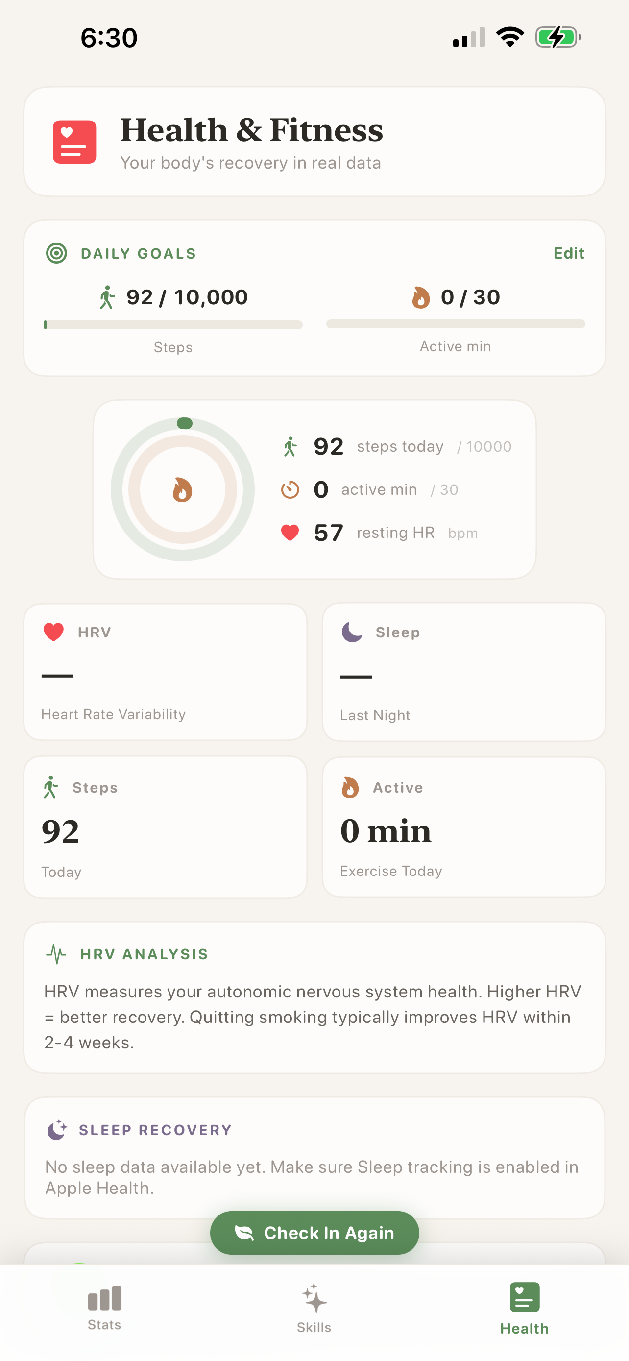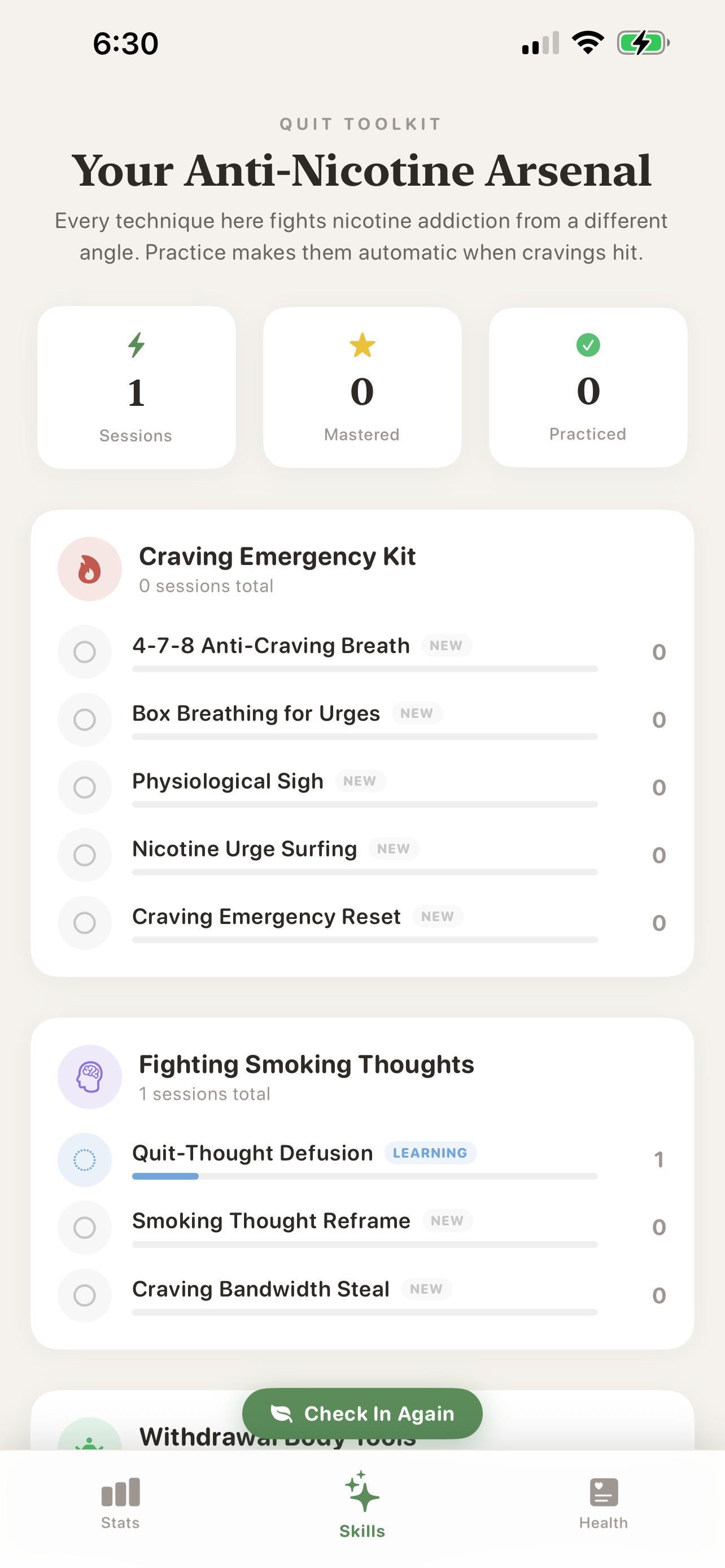 - Adaptive Check-ins: Each day begins with a clinical assessment of triggers, cravings, and emotional state.