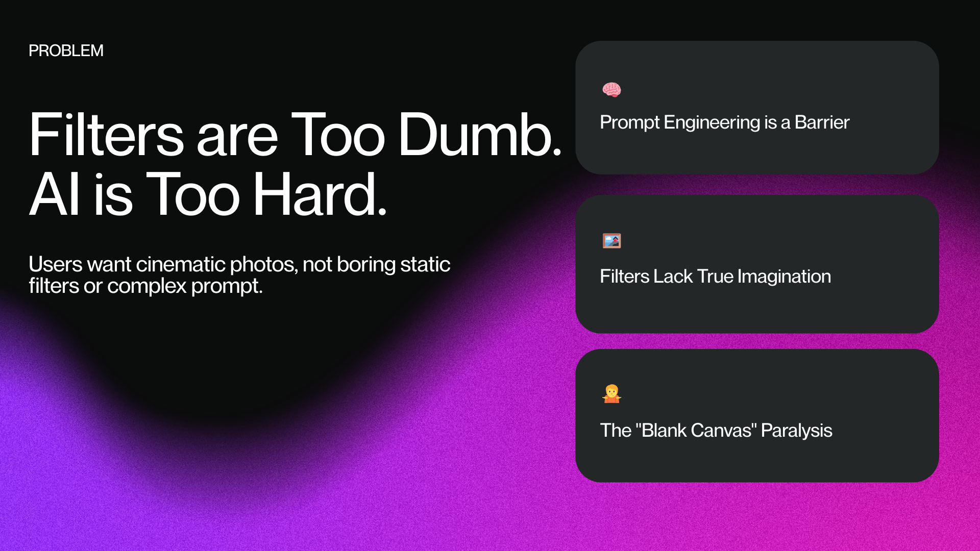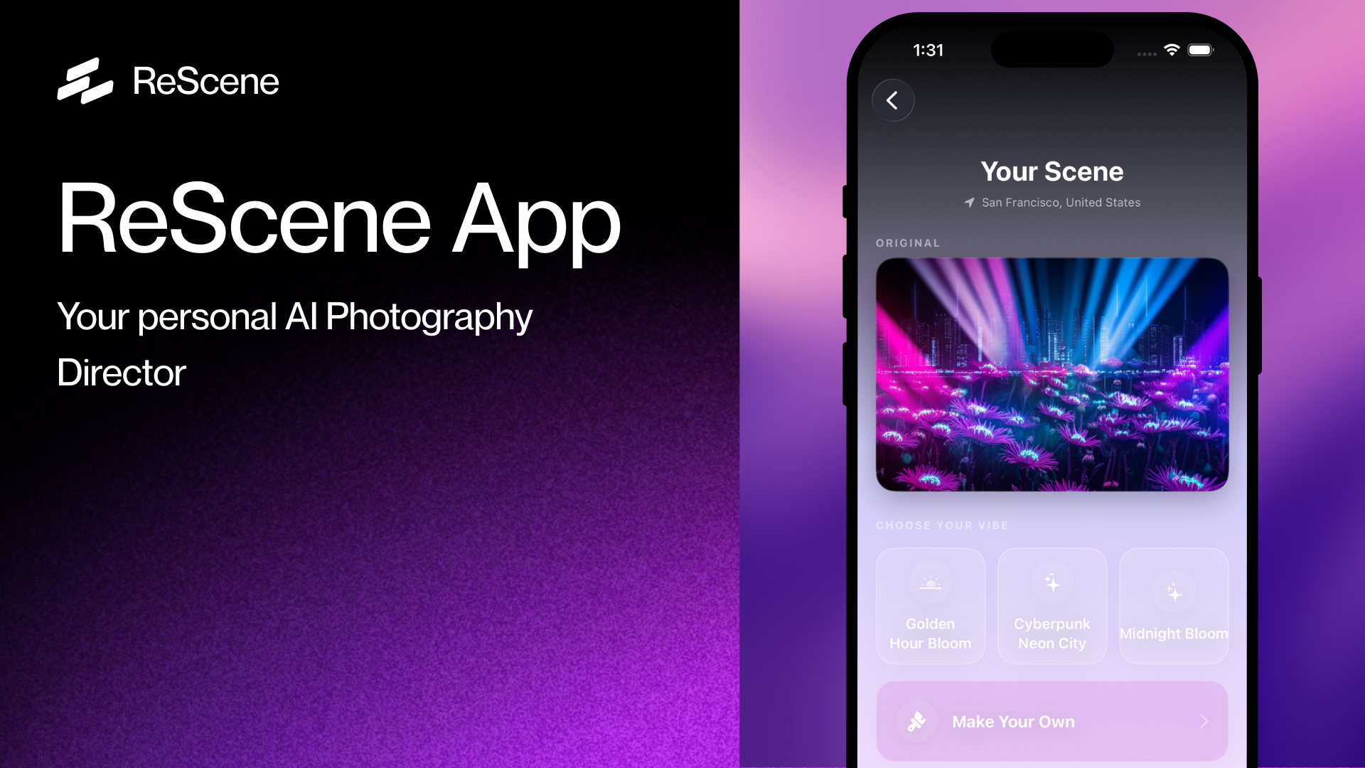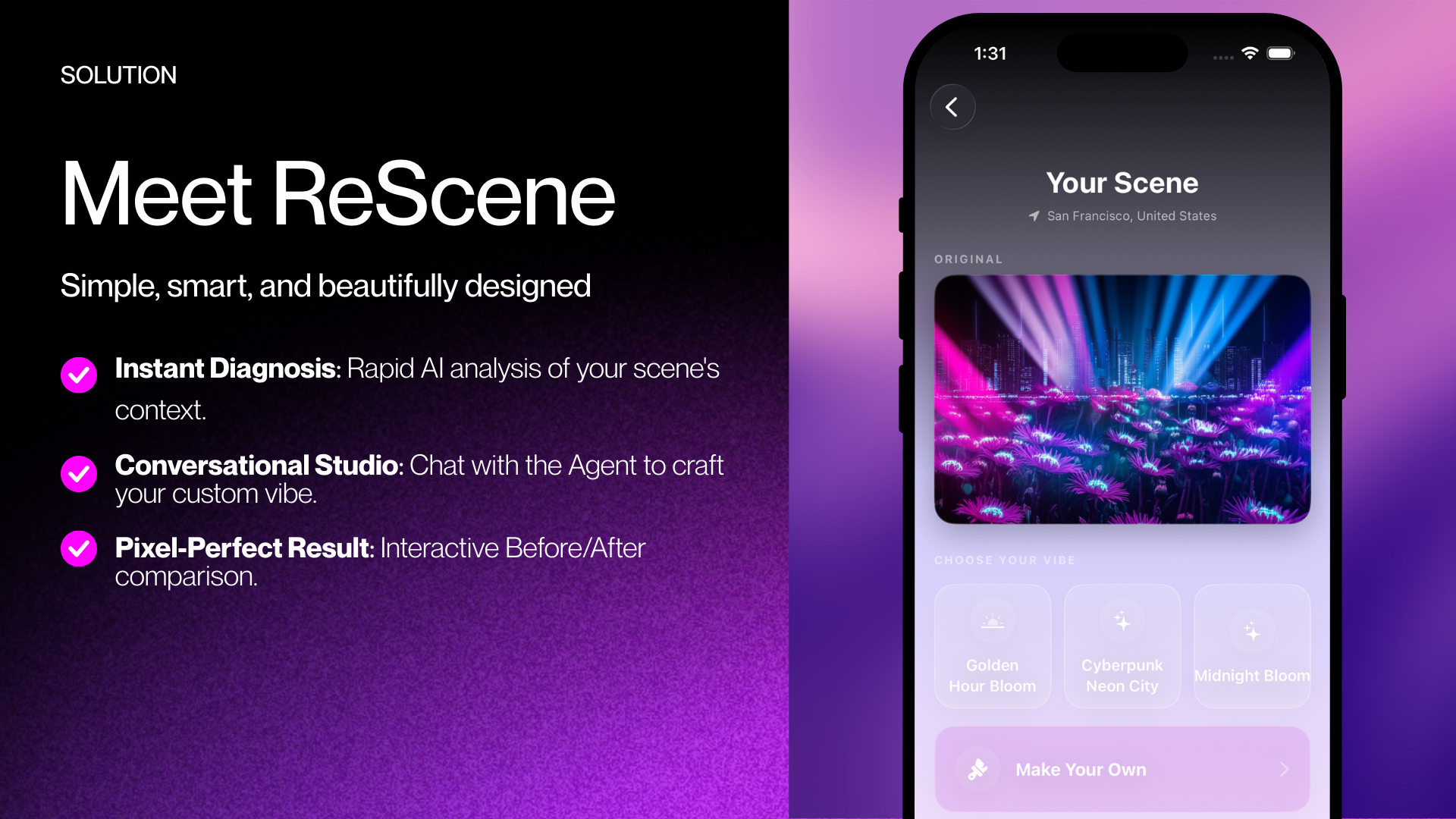 The inspiration for ReScene came from a clear gap in AI photography today. On one end, basic filter apps are easy to use but lack real creativity. On the other end, professional AI tools require complex prompt engineering, which most users find intimidating.