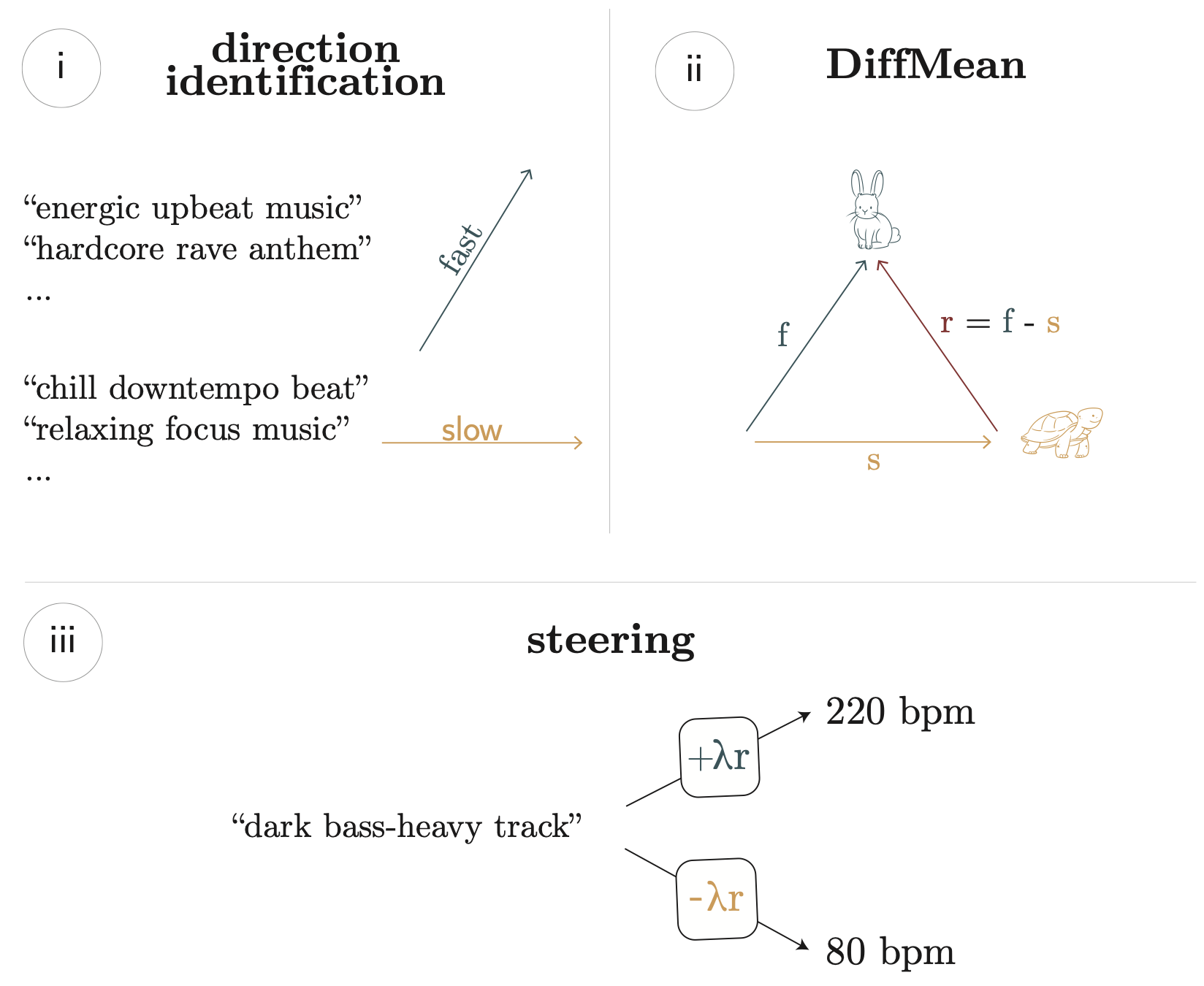 Interpretability research has practical applications. Activation steering originates in the mechanistic interpretability community, where it is typically applied to language models. Applying it to a music generation model showed us these techniques are useful well beyond model analysis: the same DiffMean approach that researchers use to find "truth" or "refusal" directions in LLMs can find "jazz" or "lo-fi" directions in MusicGen.