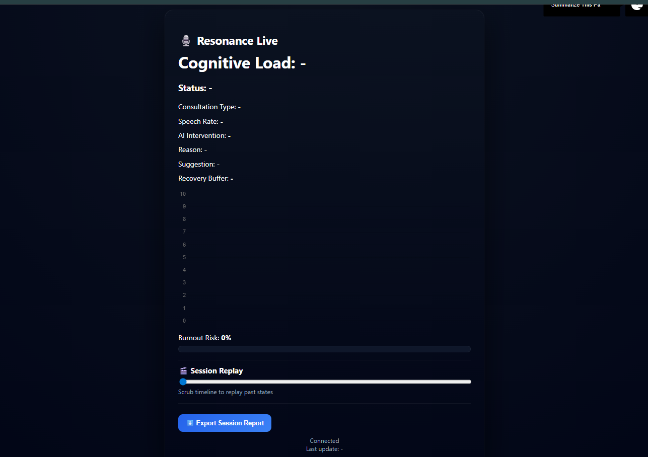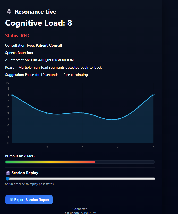 Resonance Live is a real-time cognitive load and burnout detection system for clinicians. It listens to live audio during consultations and estimates cognitive load based on prosodic features like speech rate, vocal energy, and temporal stress patterns. When sustained overload is detected, the system transitions into a low-stimulation UI mode and recommends recovery buffers — acting as a safety layer for clinician wellbeing.