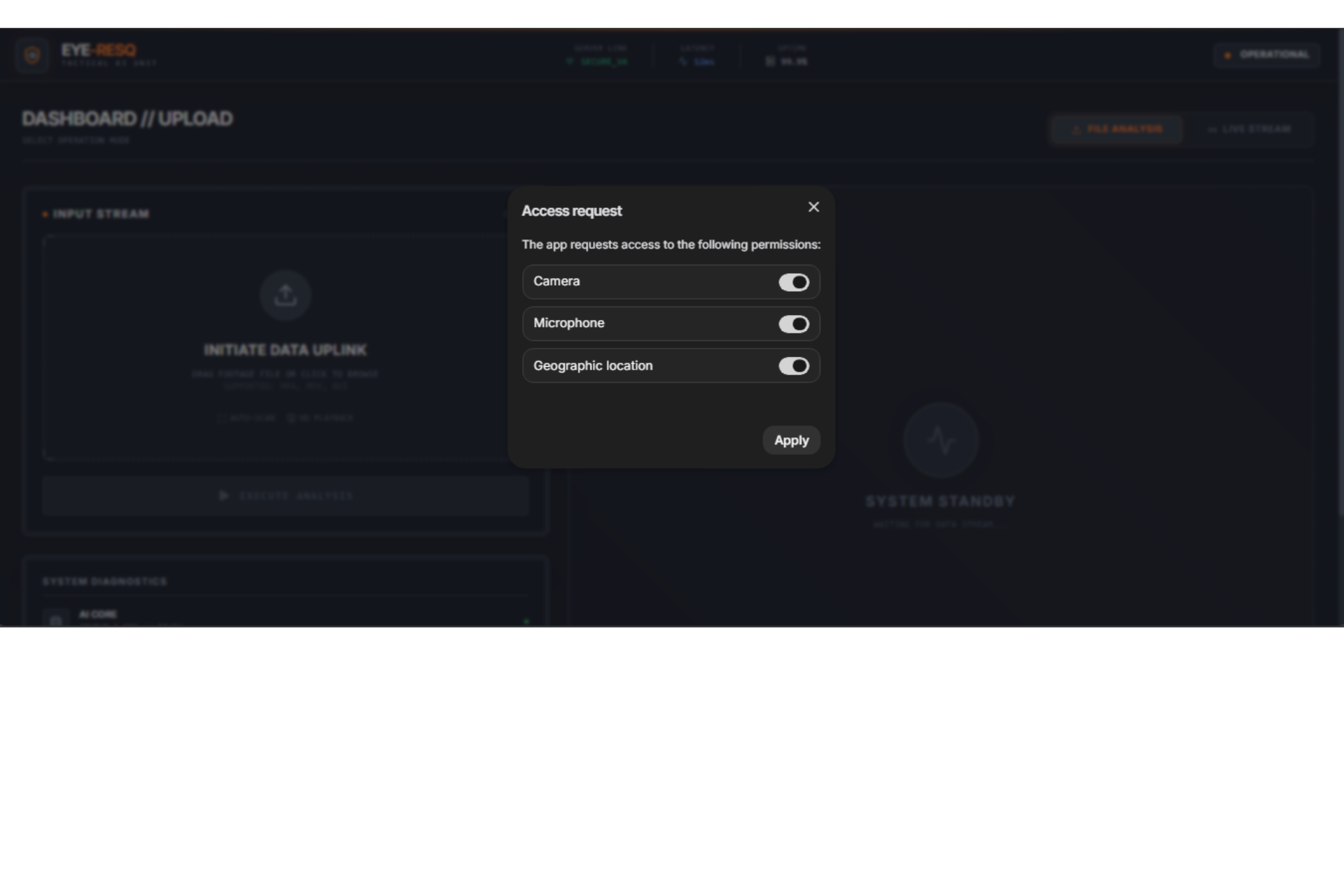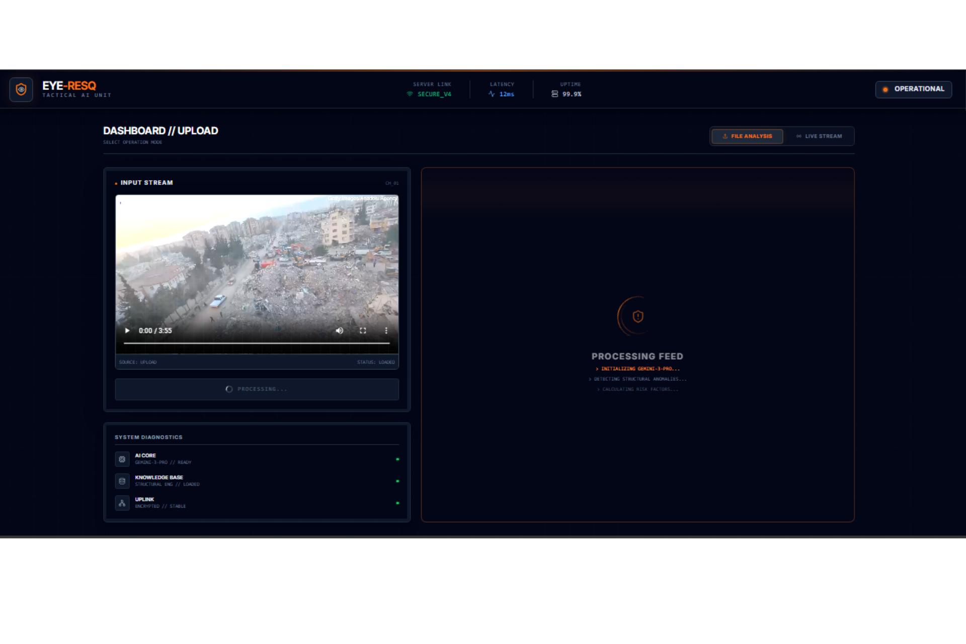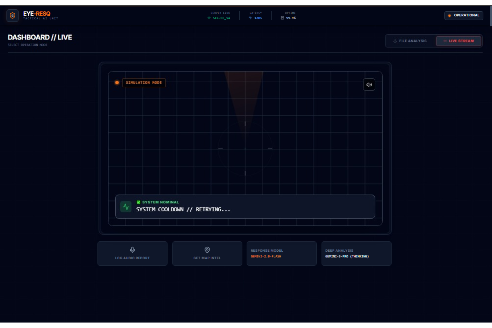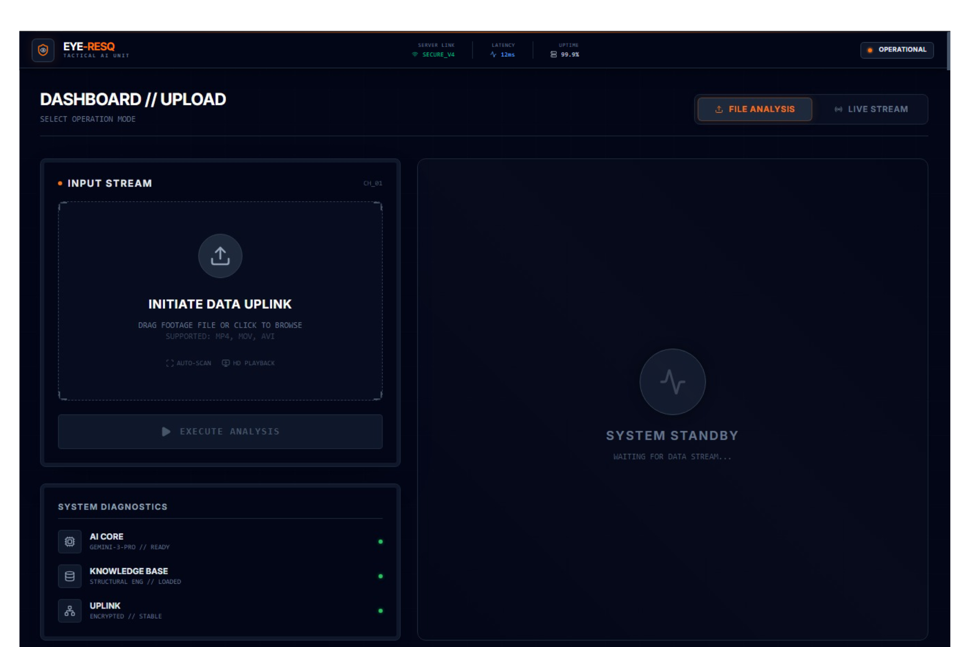 Eye-ResQ Interface: The tactical command center is online and operational. Ready for secure data uplink and structural telemetry analysis.