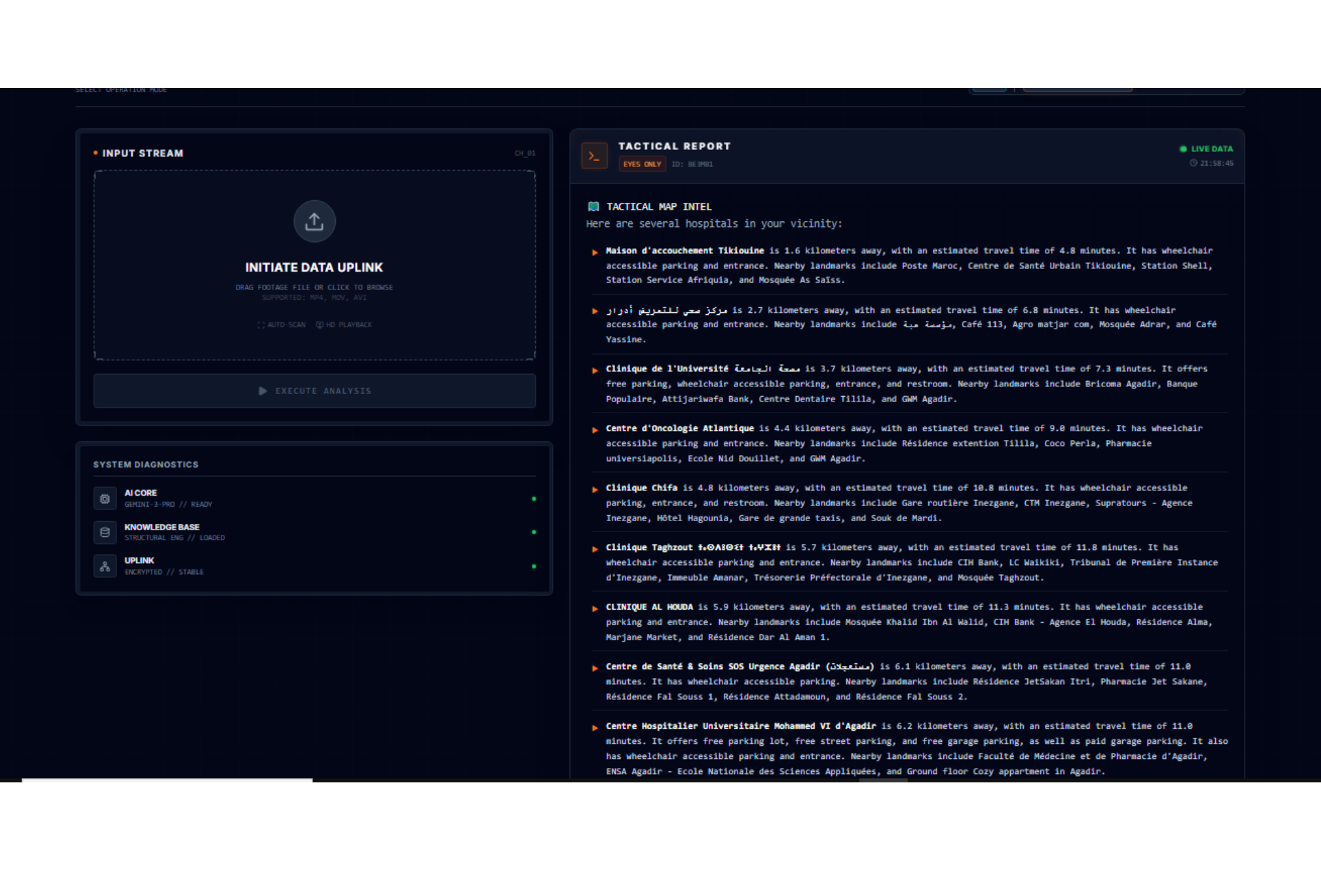 Tactical Map Intel: Autonomous triangulation of the nearest medical facilities to ensure zero-latency rescue logistics and survival triage.