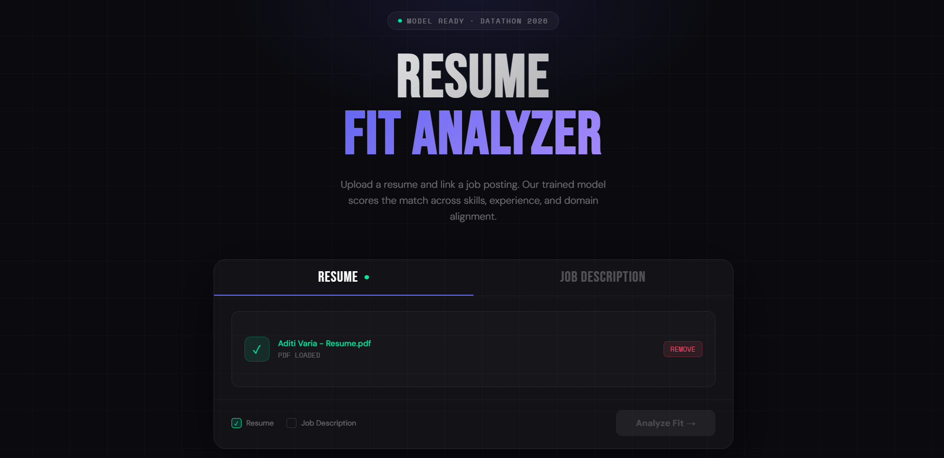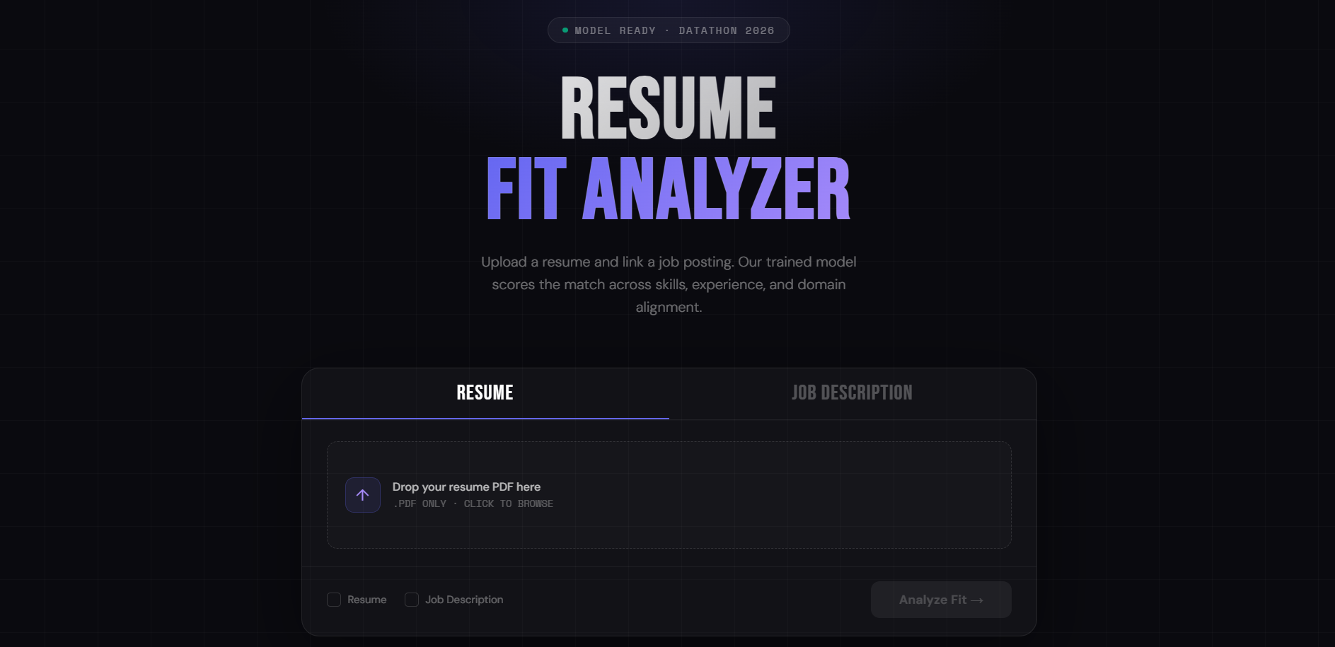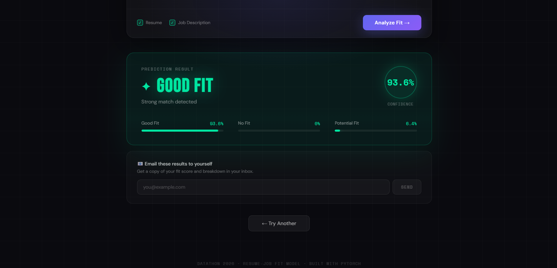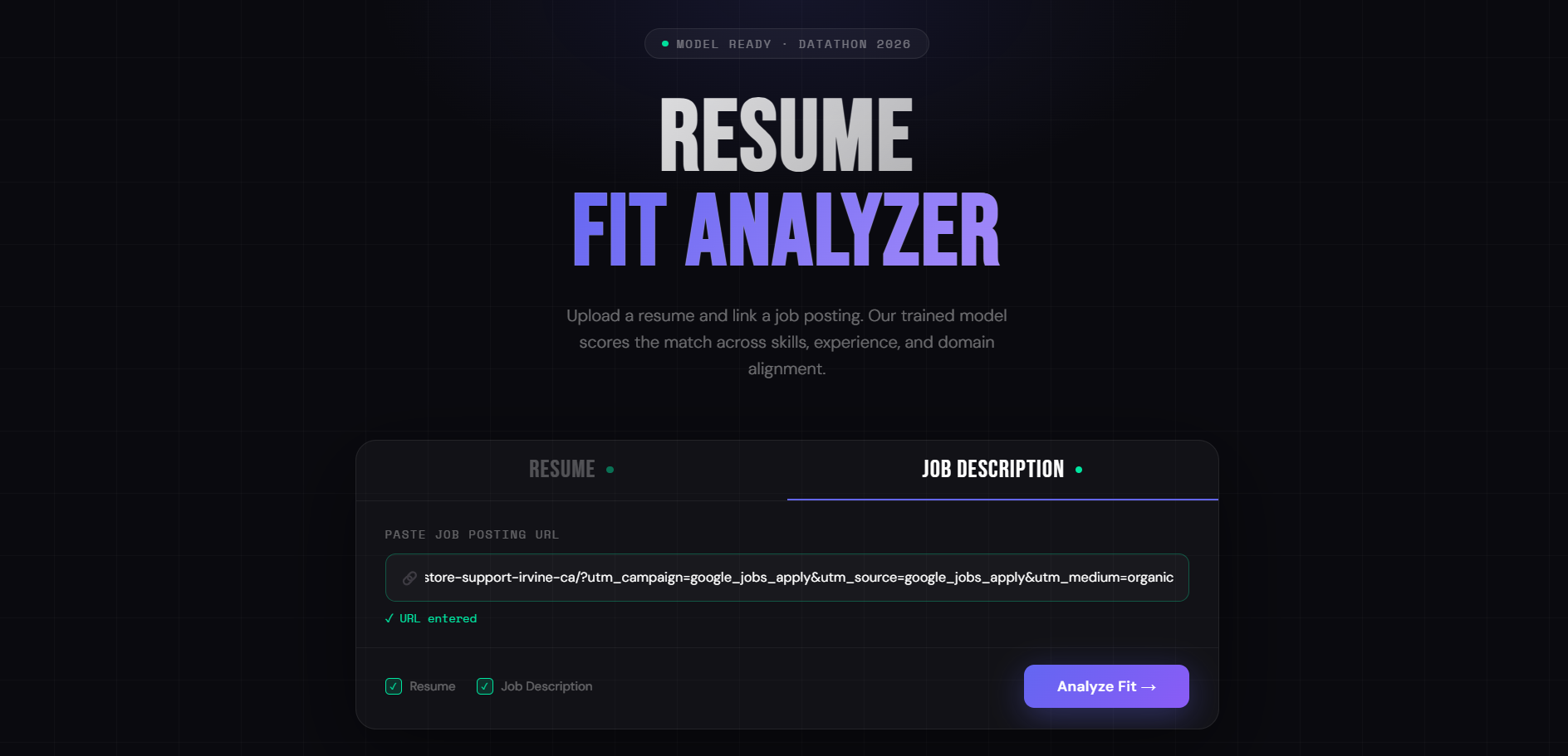 Our project allows users to upload a pdf of their resume as well as a link to a job/job description that they are interested in. In return, our trained model will classify the user as either "Not fit", "Potential fit", or "Good fit" for the specified job.