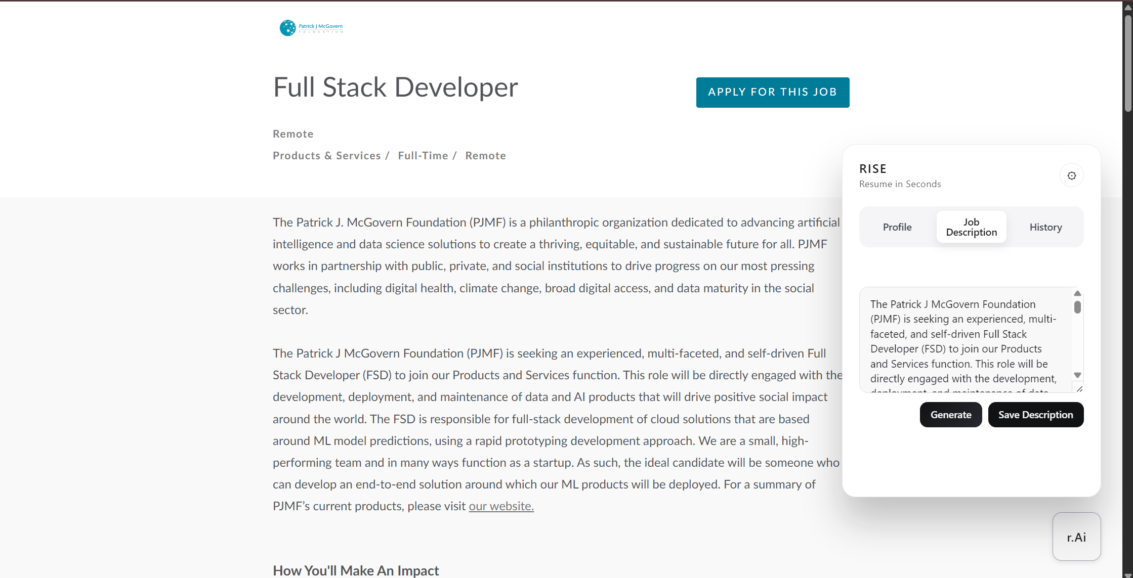 - Generate: Rise AI uses Gemini Nano to create a custom resume or cover letter that highlights your most relevant qualifications for that specific role