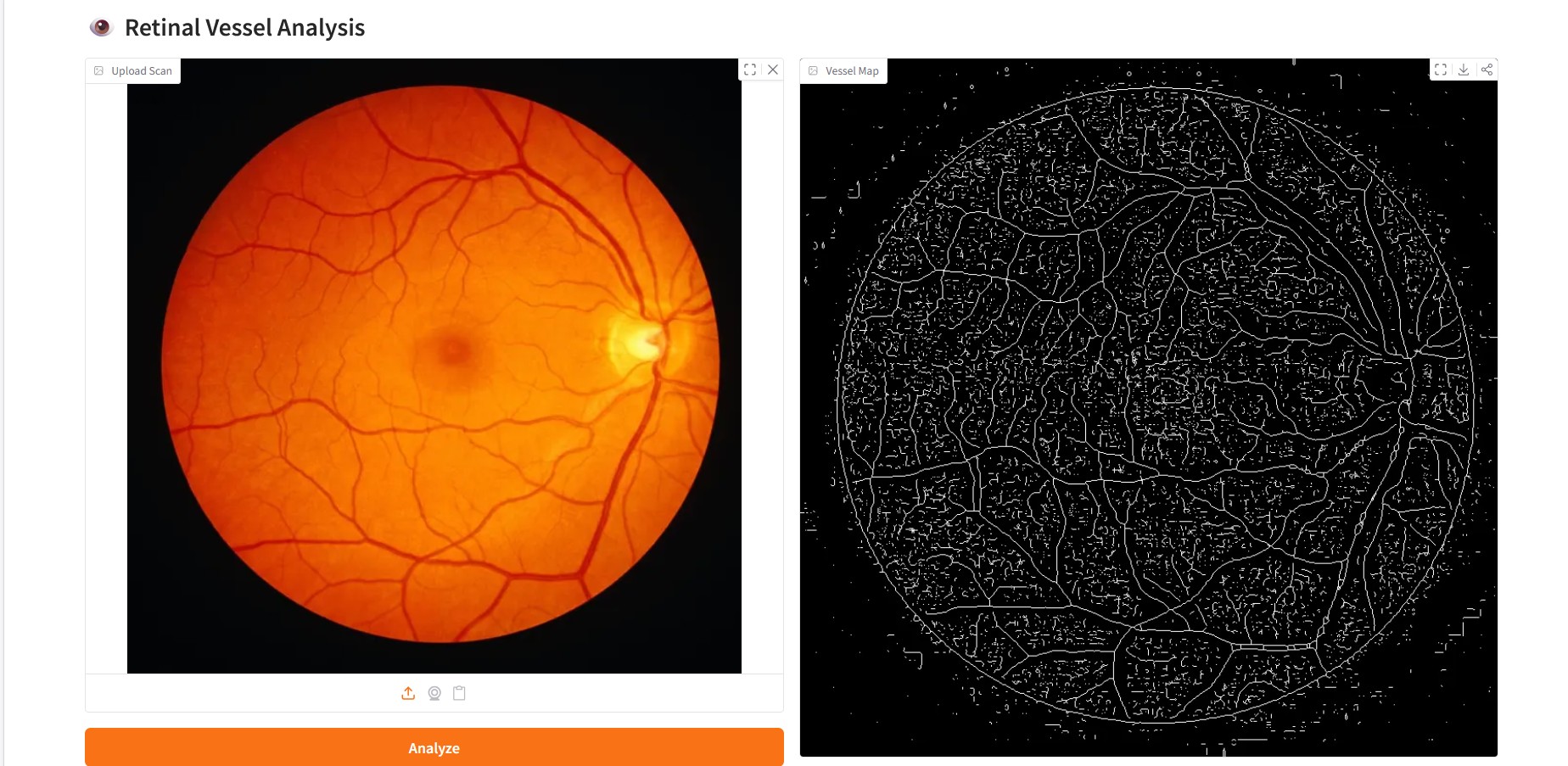- User Interface: A streamlined dashboard was created using Gradio for real-time analysis and visualization. ## Challenges we ran into • The Skeletonization Hurdle: Initially, using simple morphological erosion caused "breaks" in the vascular map, leading to inaccurate zero-width readings. Switching to the Zhang-Suen algorithm via skimage resolved this by maintaining connectivity. • Artery/Vein Differentiation: Distinguishing between arteries and veins in a static 2D image is notoriously difficult. I overcame this by implementing a heuristic statistical split (analyzing the 30% thinnest vs. 30% thickest vessels), which provided a reliable proxy for CRAE and CRVE calculation in a hackathon environment. • Local AI Integration: Ensuring the Python environment could communicate seamlessly with the Ollama server required robust exception handling to prevent the pipeline from crashing during high-resolution image processing. ## What I learned This project taught me the importance of Edge AI. By running the entire diagnostic pipeline locally, I learned that we can achieve clinical utility without compromising patient data security. It also deepened my understanding of how Six Sigma principles—specifically reducing measurement system error—apply directly to medical image analysis. ## What's next for Retina-Vessel-AI-Analyzer Looking forward to scale it into the medical field to be utilized by doctors and other medical professionals