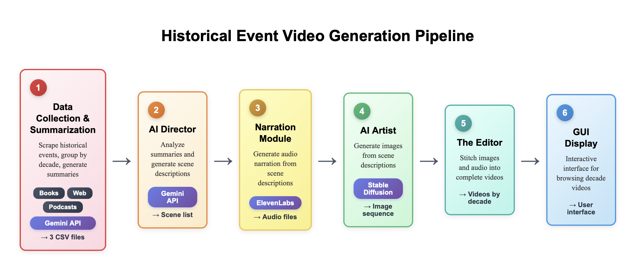 We built the system as a modular pipeline, wiring together separate components for data collection, AI generation, and presentation. First, we wrote Python scrapers to pull text from historical books, curated web pages, and podcast descriptions, then parsed that text into sentences, extracted years, and bucketed events by decade before calling the Gemini API to generate clean summaries into CSV files. Those CSVs feed into an "AI director" stage, another Gemini prompt that turns each decade's summaries into structured scene descriptions. We then use ElevenLabs' text-to-speech API to generate audio narration from those scene descriptions, creating a professional voiceover for each decade. Next, we pass the scene descriptions to an "AI artist" stage, where a Stable Diffusion pipeline renders one image per scene, and Python tooling (e.g., moviepy/ffmpeg) combines the narrated audio with the generated images to stitch the frames into video clips. Finally, we wrapped everything in a simple GUI that indexes videos by decade, letting users browse the generated archive and watch the history of the city chapter by chapter.