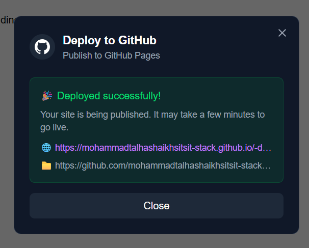Solution: I described the feature to Kiro in one conversation: "Users should authenticate with GitHub OAuth, then click a button to deploy their site." Kiro generated the entire feature—OAuth callback, GitHub API integration, export logic, deployment modal UI, and error handling—in one go.
