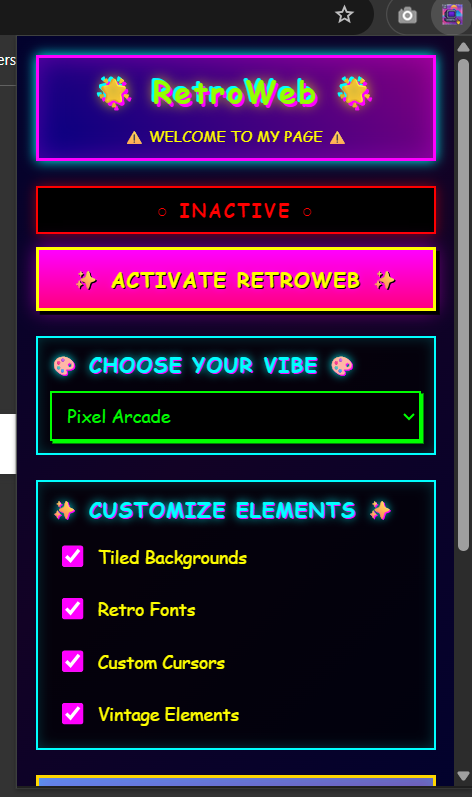 Map<tabId, TabSettings>structure with proper lifecycle management.Non-Destructive Overlay System: The extension applies retro styling without modifying the original page content, using CSS overlays and DOM manipulation that can be cleanly removed.