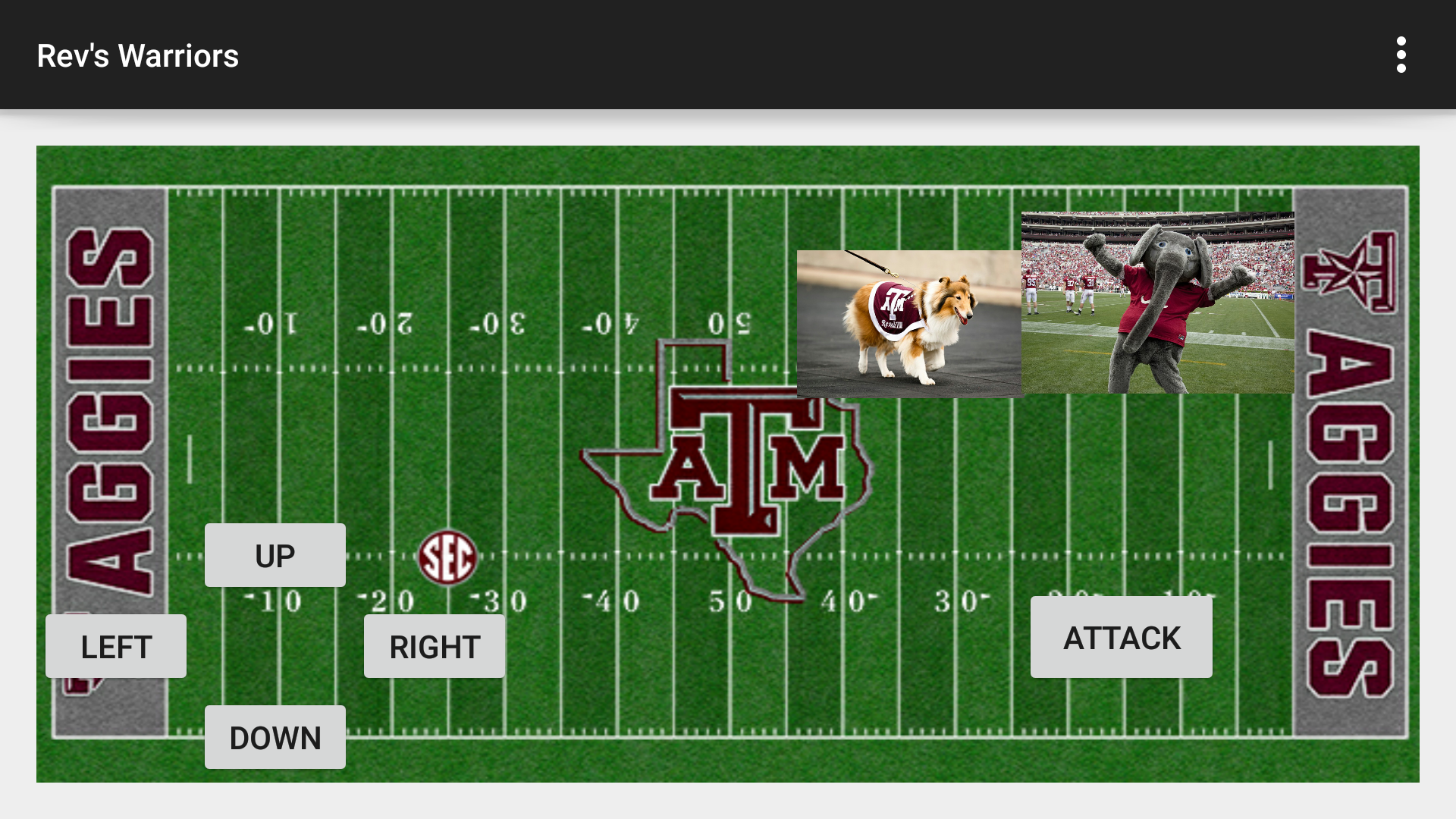 Reveille is moved by the user clicking on a direction button and she "attacks" the other teams mascot.