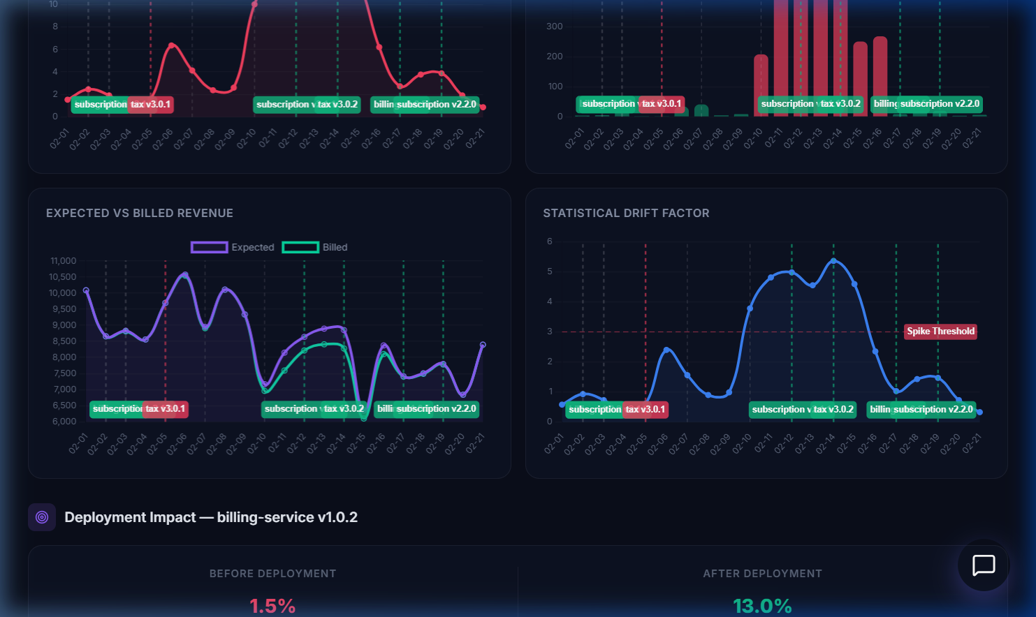 Revenue & Drift Intelligence — Expected vs Billed revenue timeline with deployment markers and statistical drift factor analysis