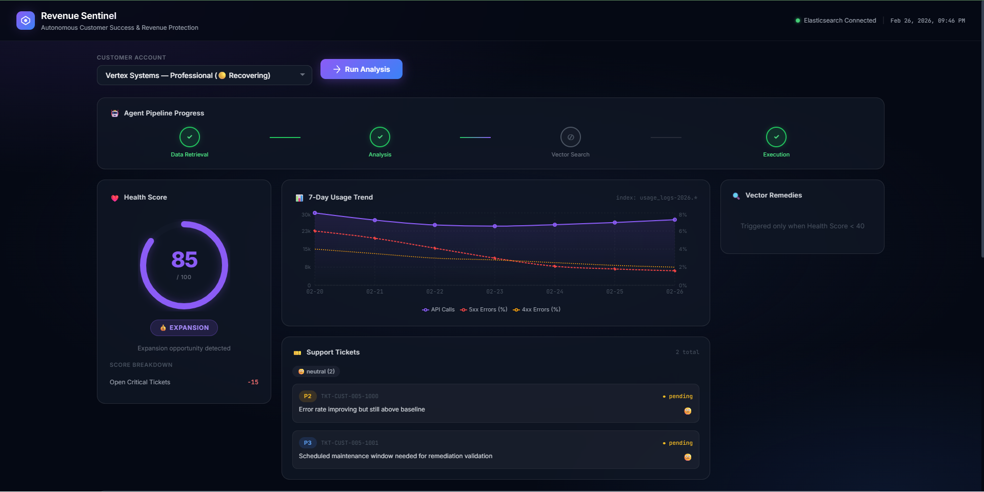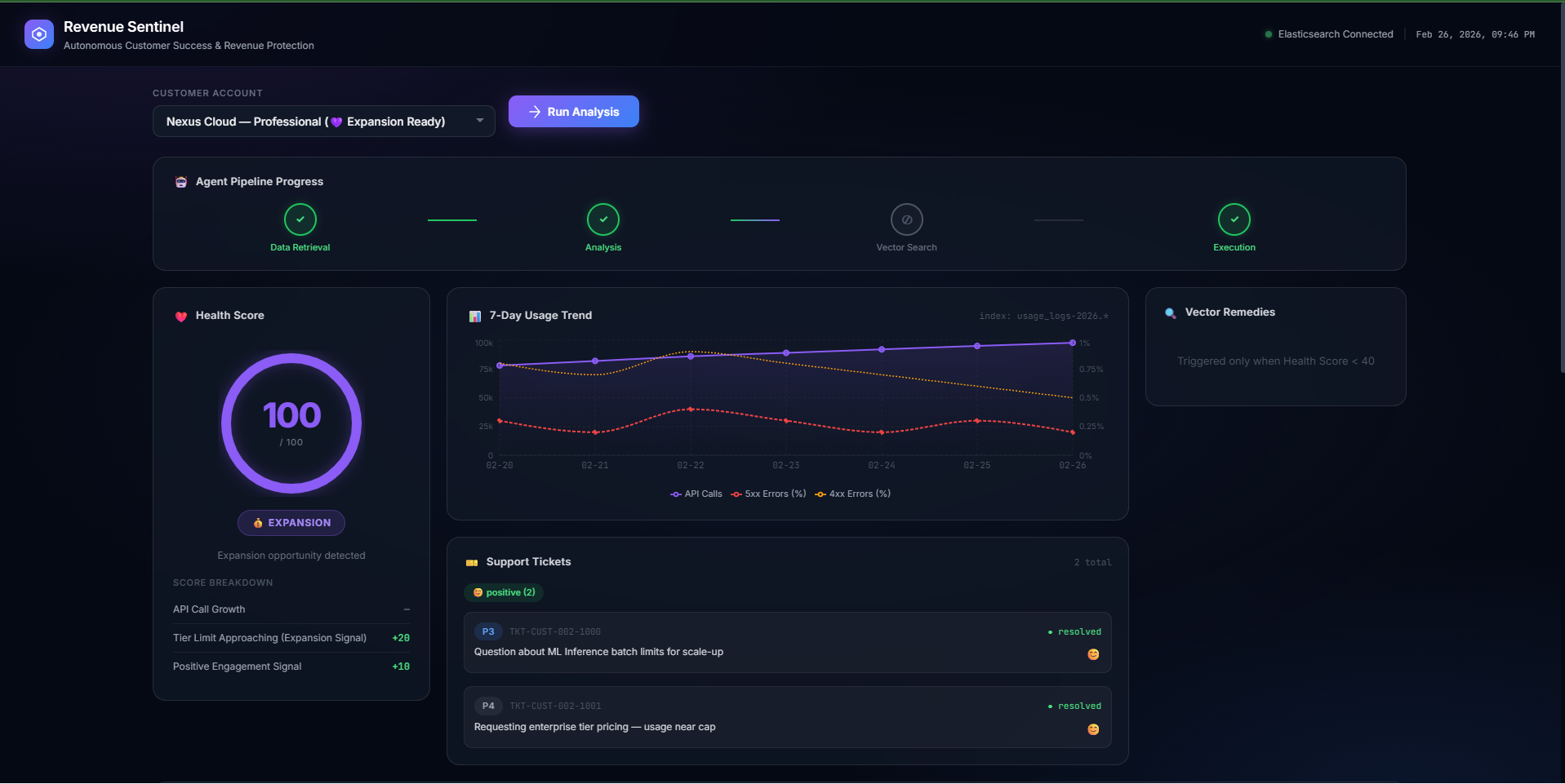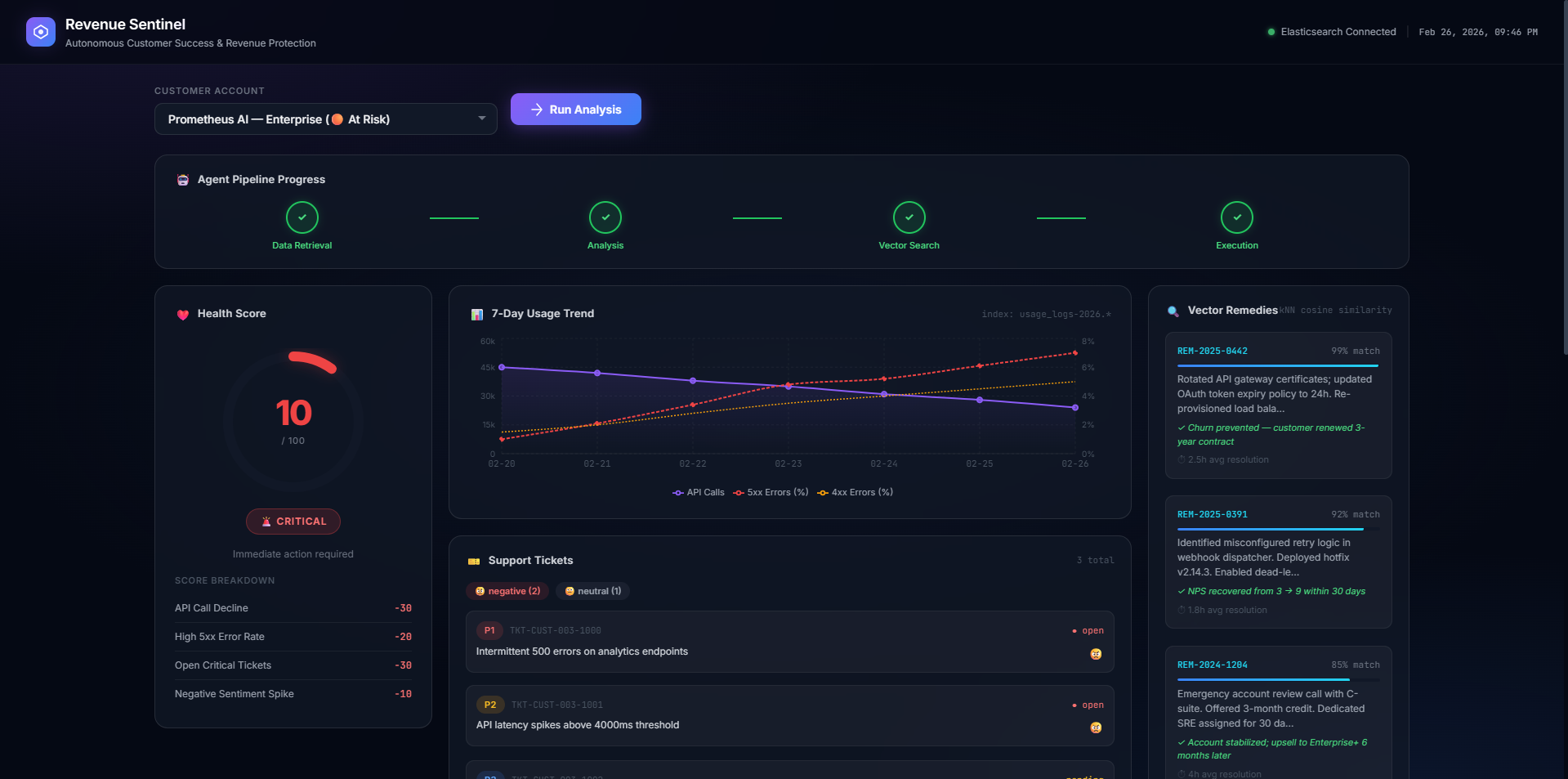 The next step is to move beyond simulation by finalizing the Google Workspace and AWS integrations for a full production environment. We also plan to implement "Predictive Churn Forecasting" by training custom models on historical Elasticsearch data to catch risks even before they appear in support tickets.