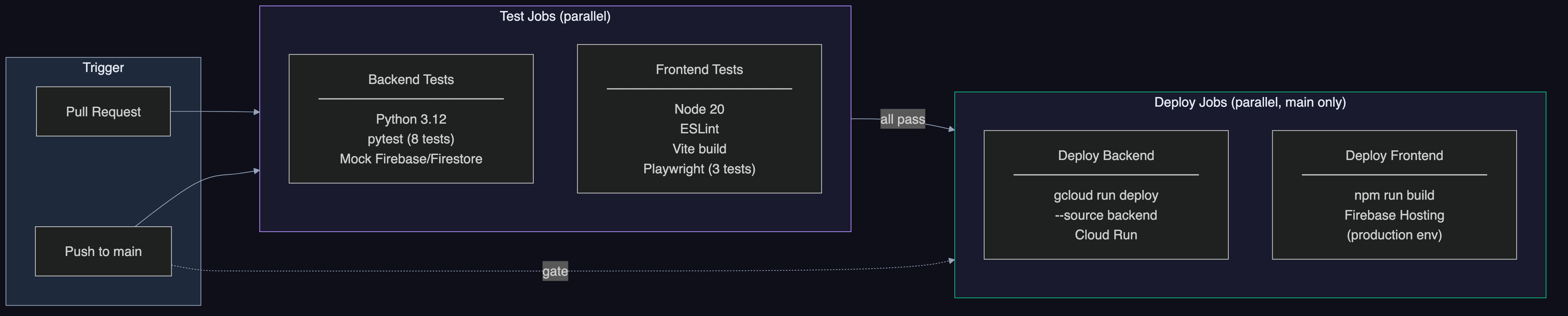 CI/CD: GitHub Actions 4-job automated pipeline - backend tests (pytest), frontend tests (Playwright), Cloud Run deploy, Firebase Hosting deploy. Every push to main triggers automated deployment.