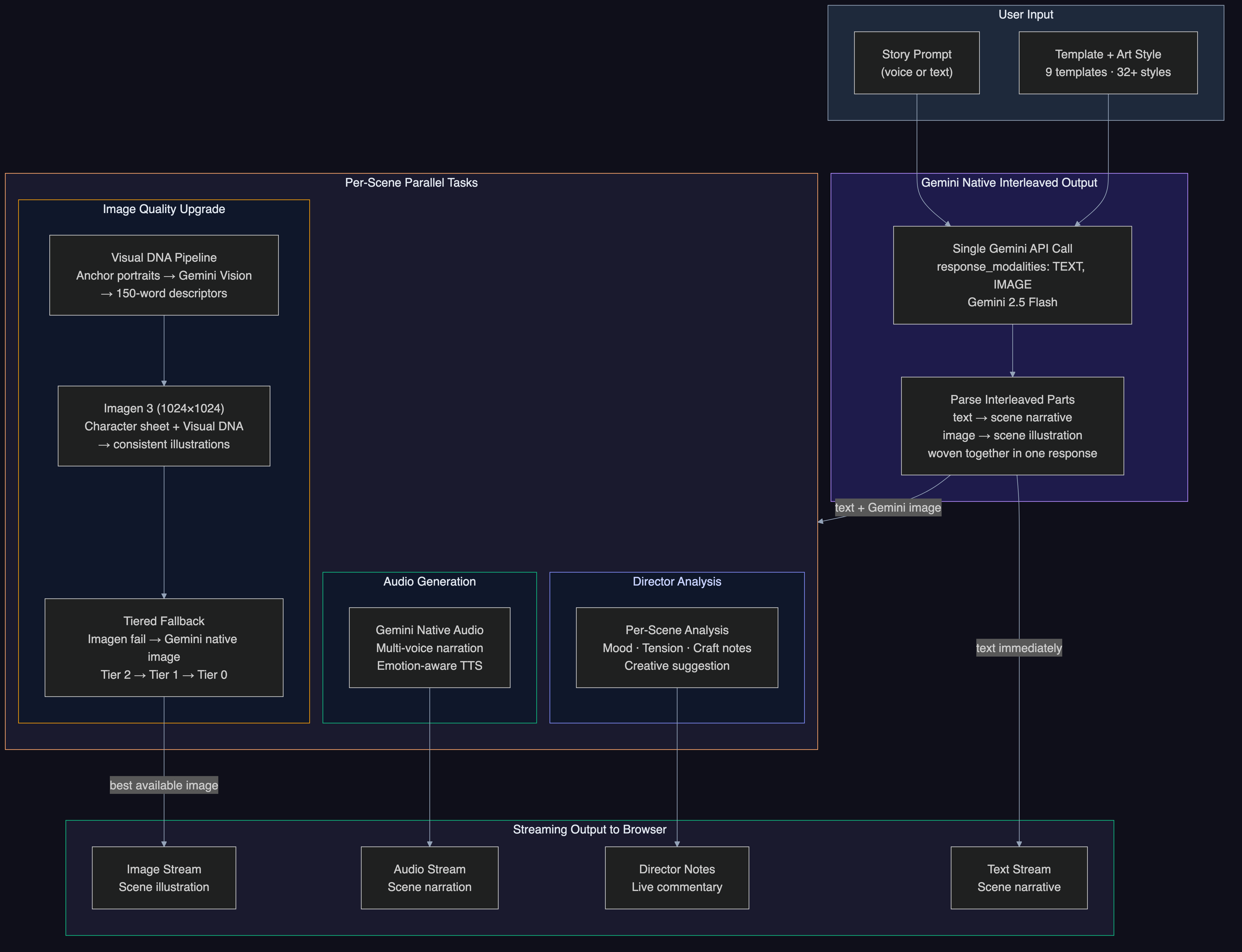 | Gemini 2.0 Flash (google-genai SDK) | Narrative generation, character extraction, scene composition, content filtering |