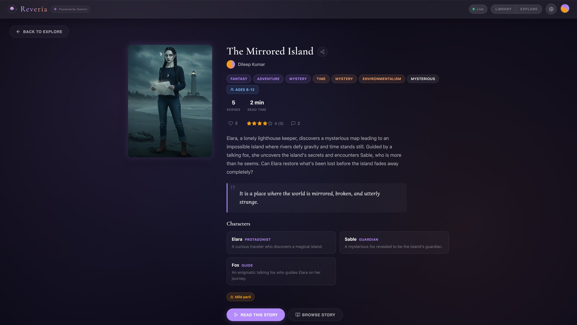 Reveria is a multimodal AI story engine that turns a single sentence into a fully illustrated, narrated storybook in real time. But it doesn't start with a text box. It starts with a voice conversation.
