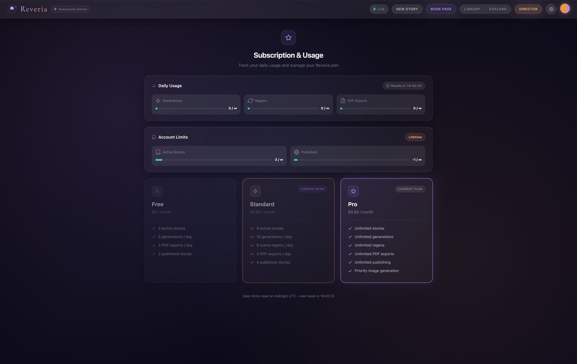 ![]() Subscription & Usage - Free, Standard, and Pro tiers |