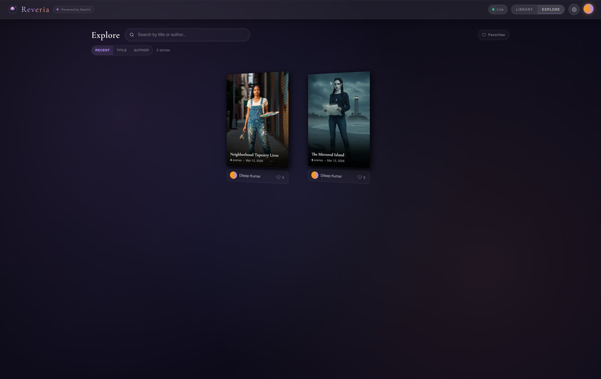 | Library & Explore | Save stories, publish to a community feed, discover other creators |