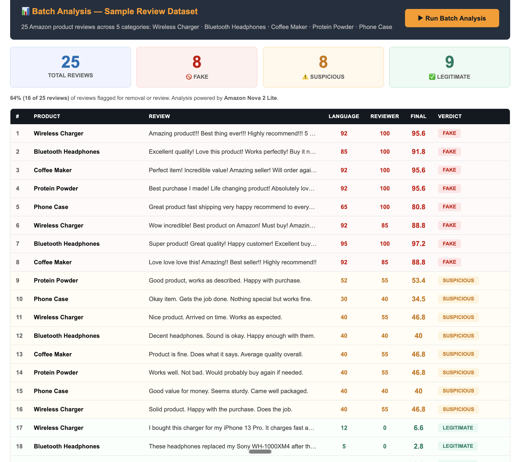 - Architecture: Each agent runs independently and returns structured JSON, making the system modular and easy to extend with the remaining 3 agents ## Challenges we ran into Getting Amazon Nova 2 Lite to consistently return valid JSON required building a fallback parser — Nova occasionally adds prose before or after the JSON block. Calibrating the weighted scoring between the two agents so that borderline reviews correctly land in the SUSPICIOUS band (rather than being forced into a binary decision) took careful tuning. We also had to handle the macOS AirPlay port conflict on port 5000 during development. ## Accomplishments that we're proud of The batch analysis feature is something we're genuinely proud of — it shows the real-world use case clearly. Running 25 reviews through both agents and surfacing 8 fake, 8 suspicious, and 9 legitimate reviews in under 2 seconds demonstrates how this system would actually work at Amazon's scale. The explainability of each verdict — not just a score but a reason — is also something that sets this apart from black-box classifiers. ## What we learned Amazon Nova 2 Lite's ability to return structured, reasoned output from a natural language prompt is more powerful than we expected. Multi-agent systems are only as good as their orchestration layer — getting the weighted combination right matters more than any individual agent's accuracy. We also learned that for fake review detection, reviewer behavioral signals are just as important as the text itself. ## What's next for ReviewGuard AI