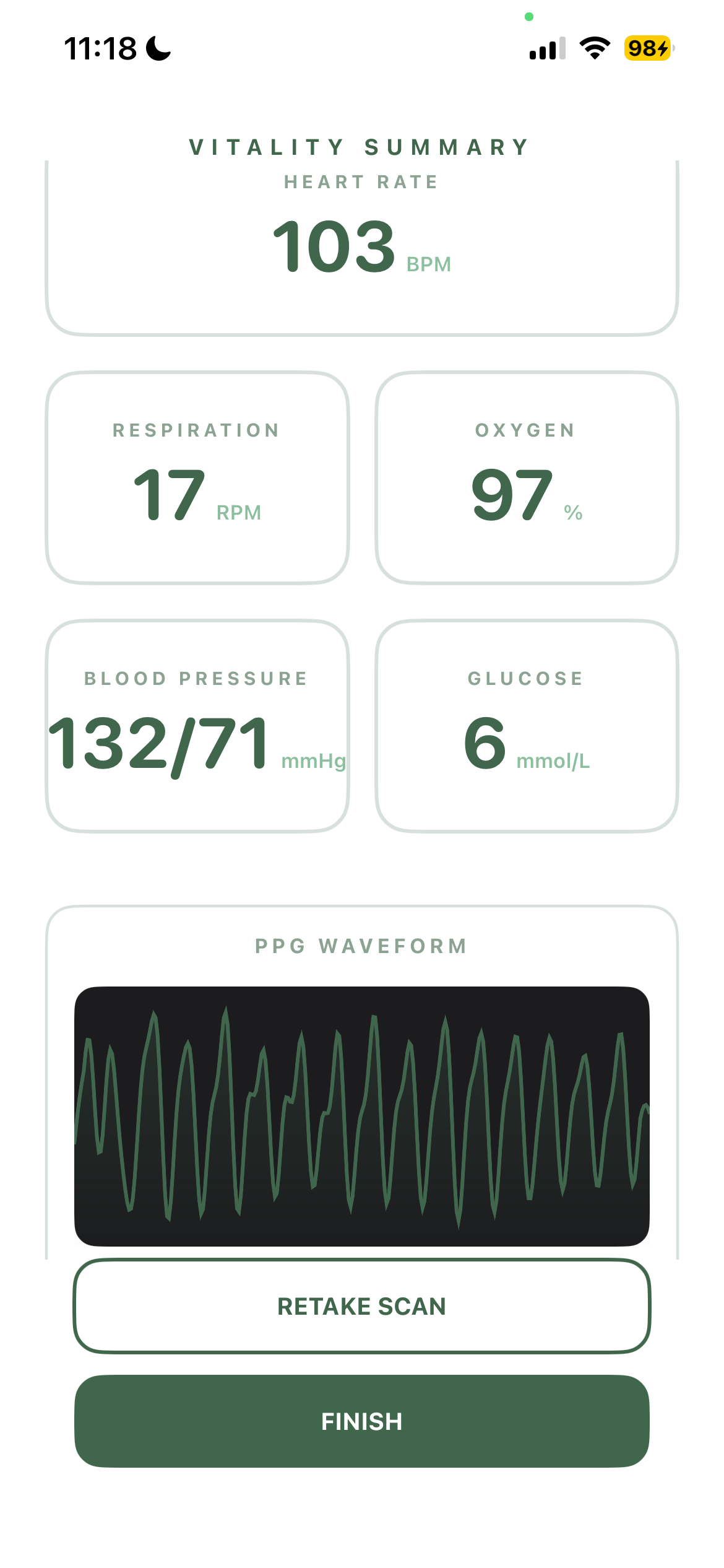 We also had to bridge very different technical components built by different teammates: video-based PPG extraction, learned predictors for additional metrics, and LLM-based summarization. Making those pieces work together coherently in a single user-facing flow was one of the hardest and most rewarding parts of the build.