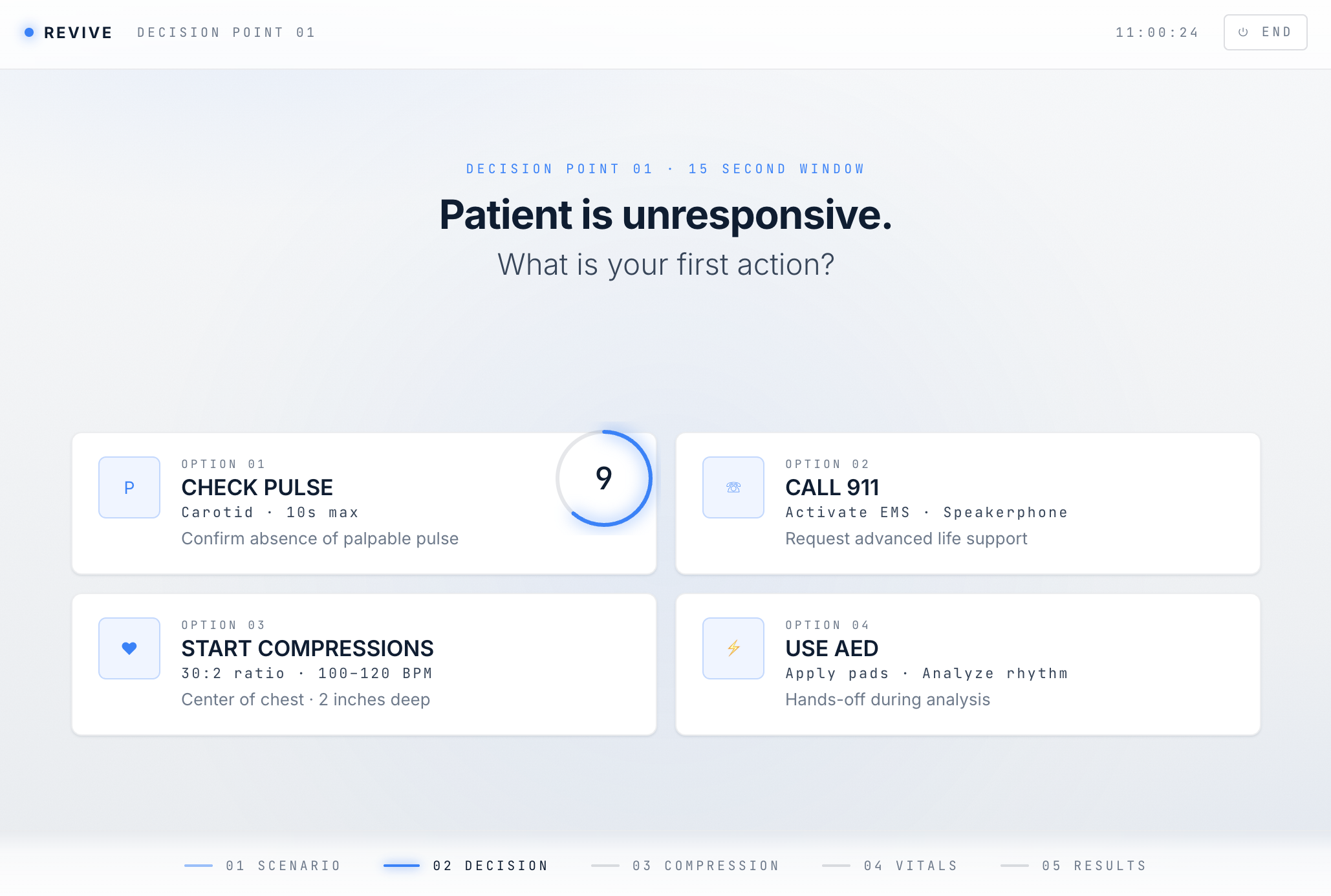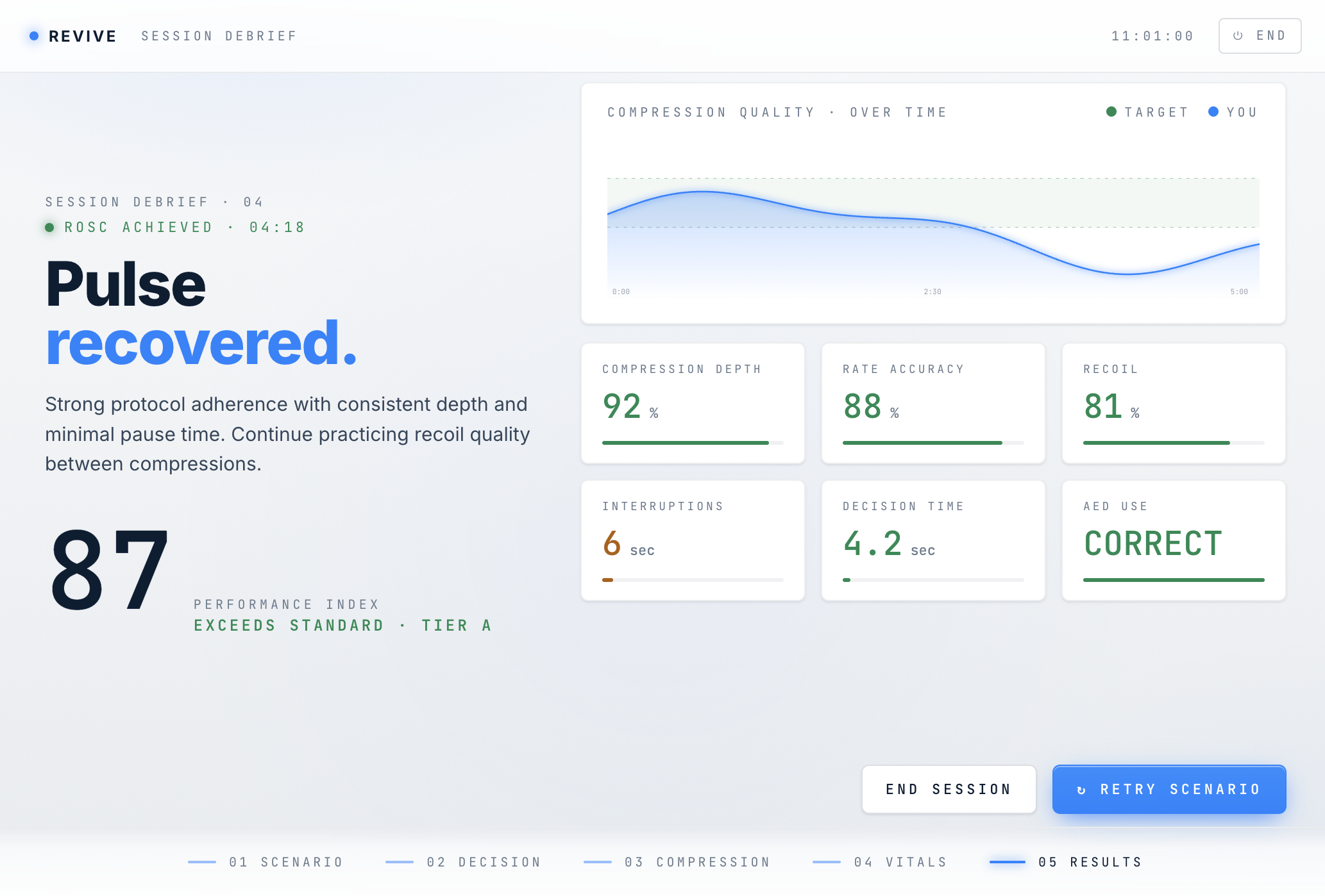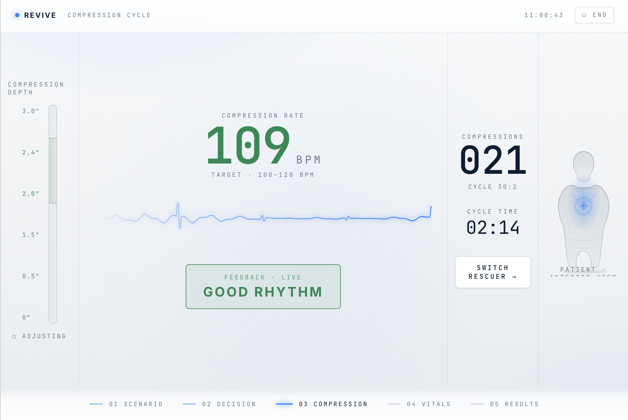 Web App: Next.js frontend with a single smoothed compression stream consumed by all agents. One vitals strip, one coaching line, one decision card visible at any moment — designed for a judge with three minutes, not a power user.