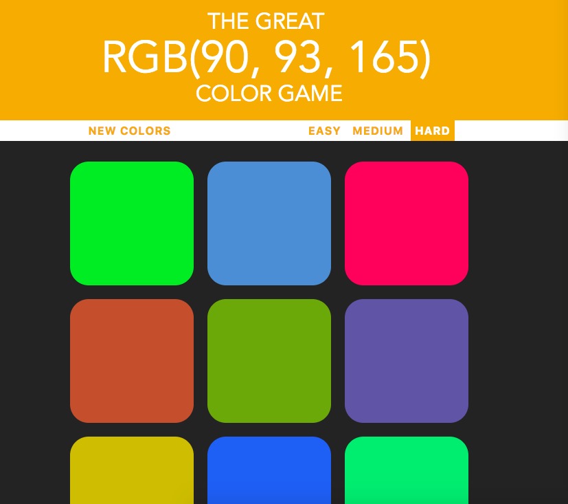 The game is a color guessing game based on the RGB color system. It has three different modes: easy, medium and hard. The player has to choose one of the colors that match the randomly generated RGB numbers.