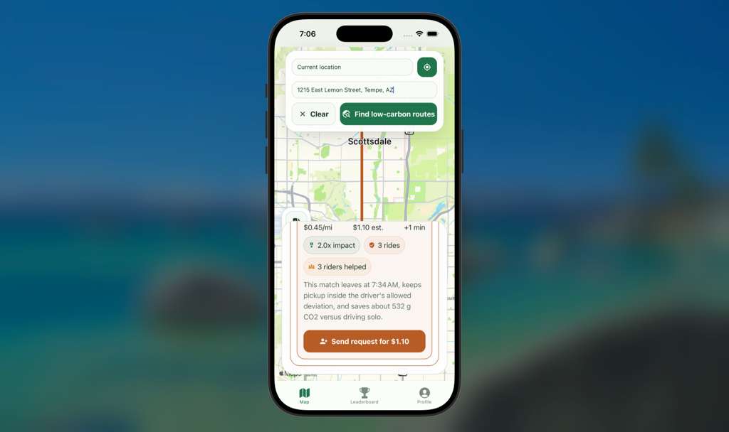 Transportation is one of the biggest sources of everyday carbon emissions, but most people make commuting decisions based on convenience and speed, not sustainability. We wanted to challenge the idea that greener travel always takes more effort. Ride Green was inspired by the belief that sustainable choices should feel just as accessible as the default option, with quick shortcuts that let users explore better alternatives in just one tap.