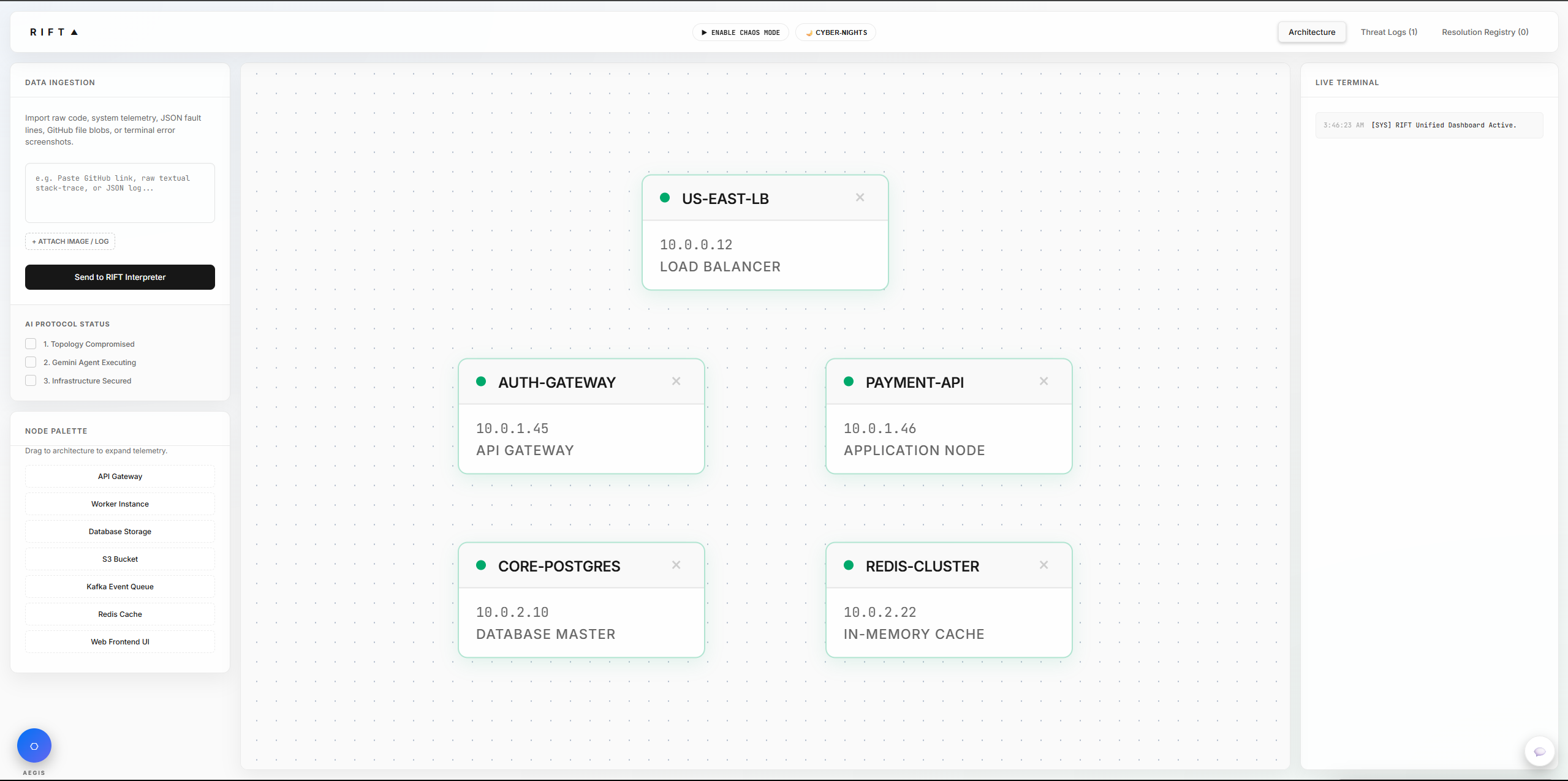 RIFT is a multi-agent cyber-topology engine that turns raw, chaotic inputs into live, visual, autonomous system behavior.