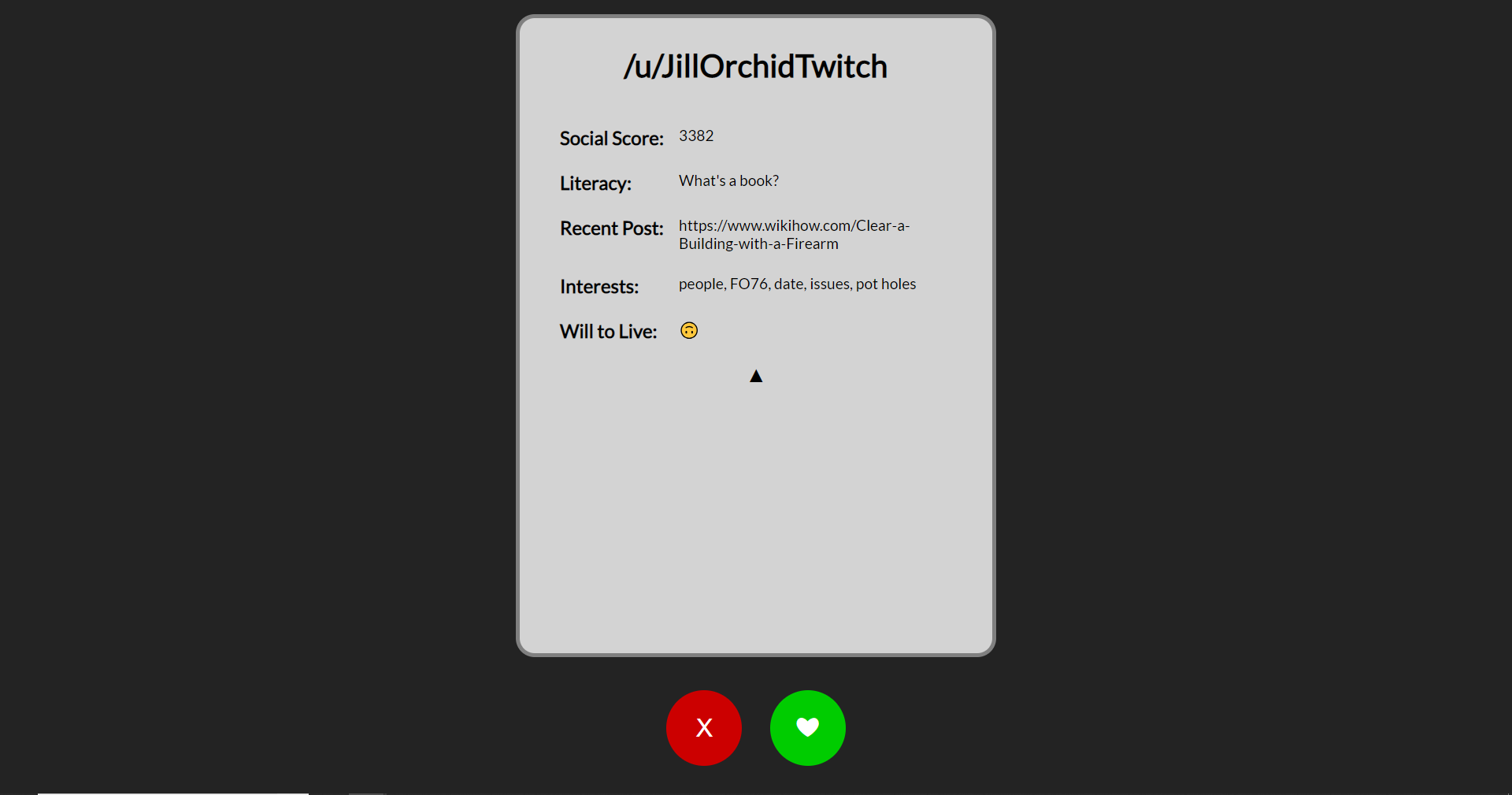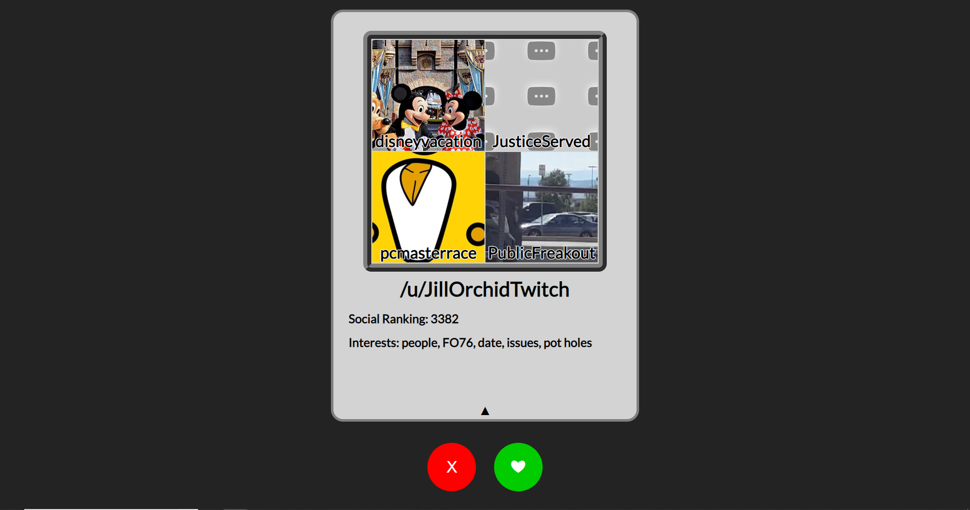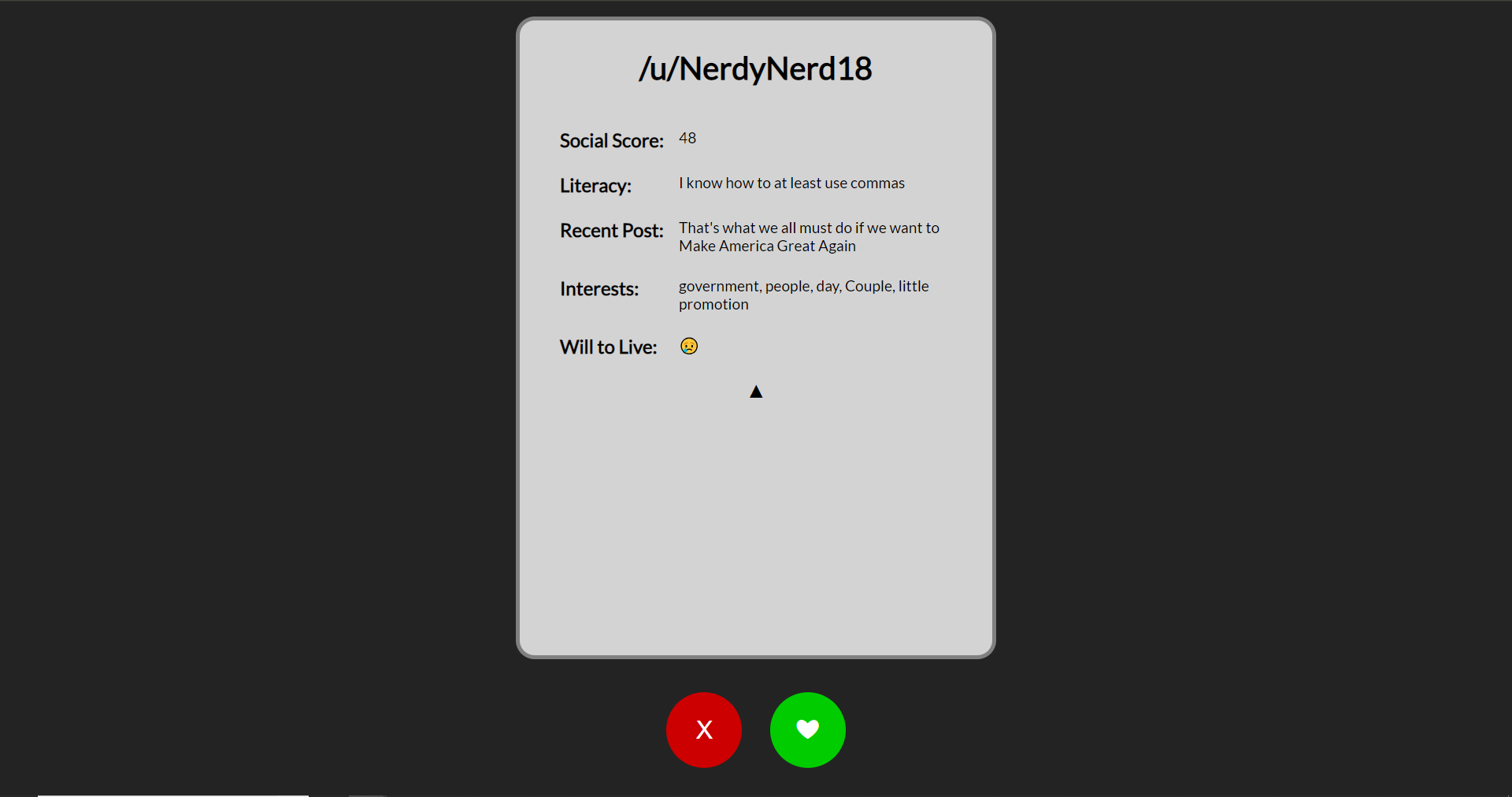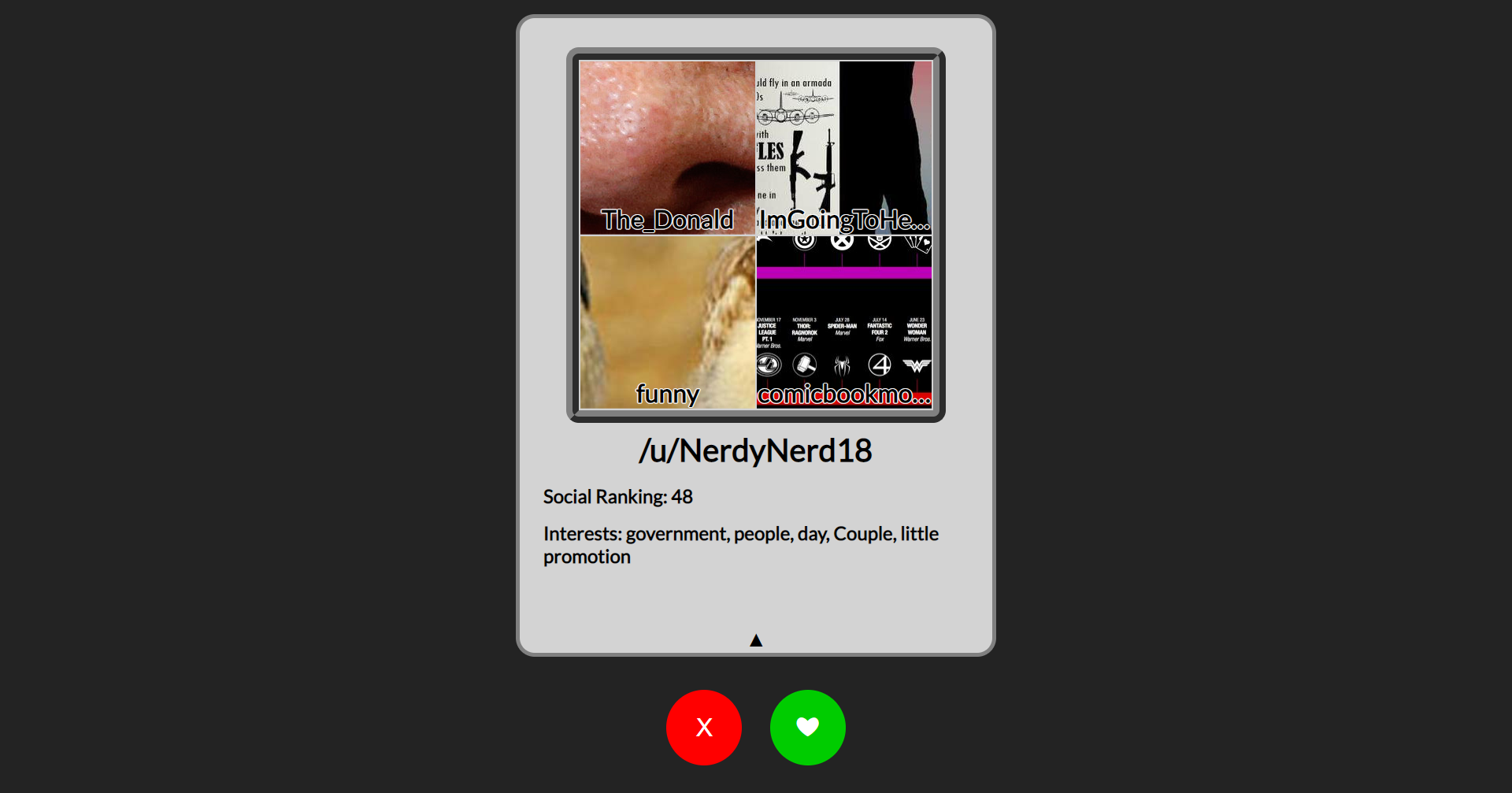 Are you fed up of modern dating apps, always the same kind of uninteresting people? Neither are we, but we made this anyway, so you can awkwardly message strangers on Reddit. We understand that people value different things so we've decided to make this API as adaptable as possible. First of all, when it comes to dating apps it's far too easy to lie about one's interests, everyone claims to "enjoy travelling" whereas our app mines your interests from all of your conversations without any concern for privacy whatsoever, that drunken reddit comment you posted on r/funny? Don't worry we've read it and recorded it so anyone on our app knows just how unfunny you are. On that topic obviously some people care about their social status so we ensure that you know just how high-class that redditor is, whether it be their gild status, or their karma. If you want an insight into how educated they are, we run spell checks to check for literacy and give you an estimated writing age! Or perhaps you just like those edgy types, don't worry we've got that covered too, using state of the art sentiment analysis we can see just how positive you are while sitting on the toilet typing away on your phone, if you're super negative then don't worry I'm sure you can find people with just as little will to live as you.