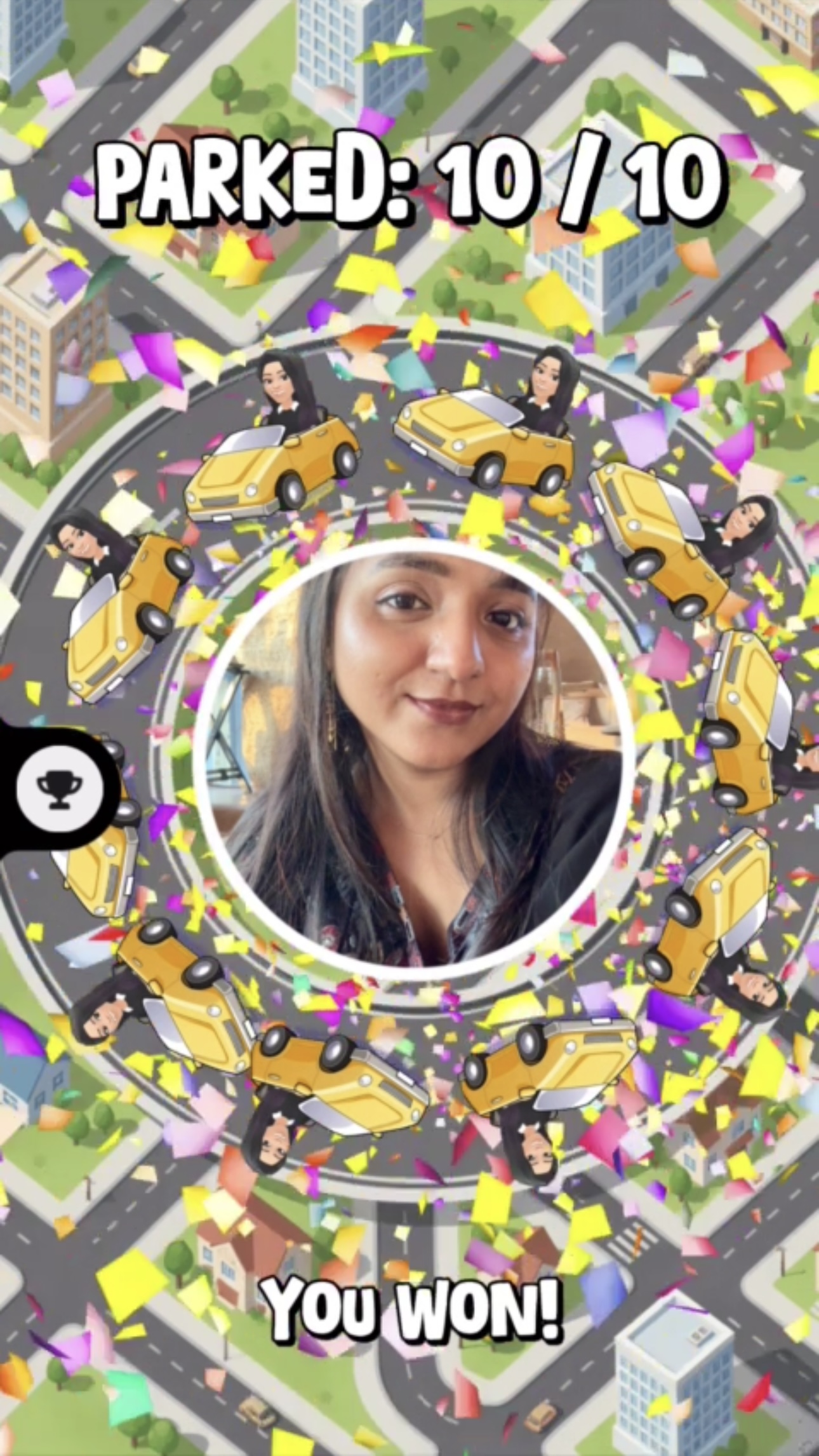 Focusing on the 2D category, I built this project by: 2D Asset Management: Utilizing the 2D bitmoji Stickers as the main player Rotational Math: Using JavaScript to calculate the 2D coordinates of the cars as they orbit, ensuring the "Park" transition is smooth and frame-perfect. Leaderboard Logic: Setting up the global and friend-based scoring system to track "Total Attempts," making every mistake feel meaningful. Adaptive Difficulty: Scripting a linear speed increase that peaks at the 10th car, creating a "boss-level" feel for the final park. Crash screen shake and sound with parking audio, amazing confetti burst on winning is the best part