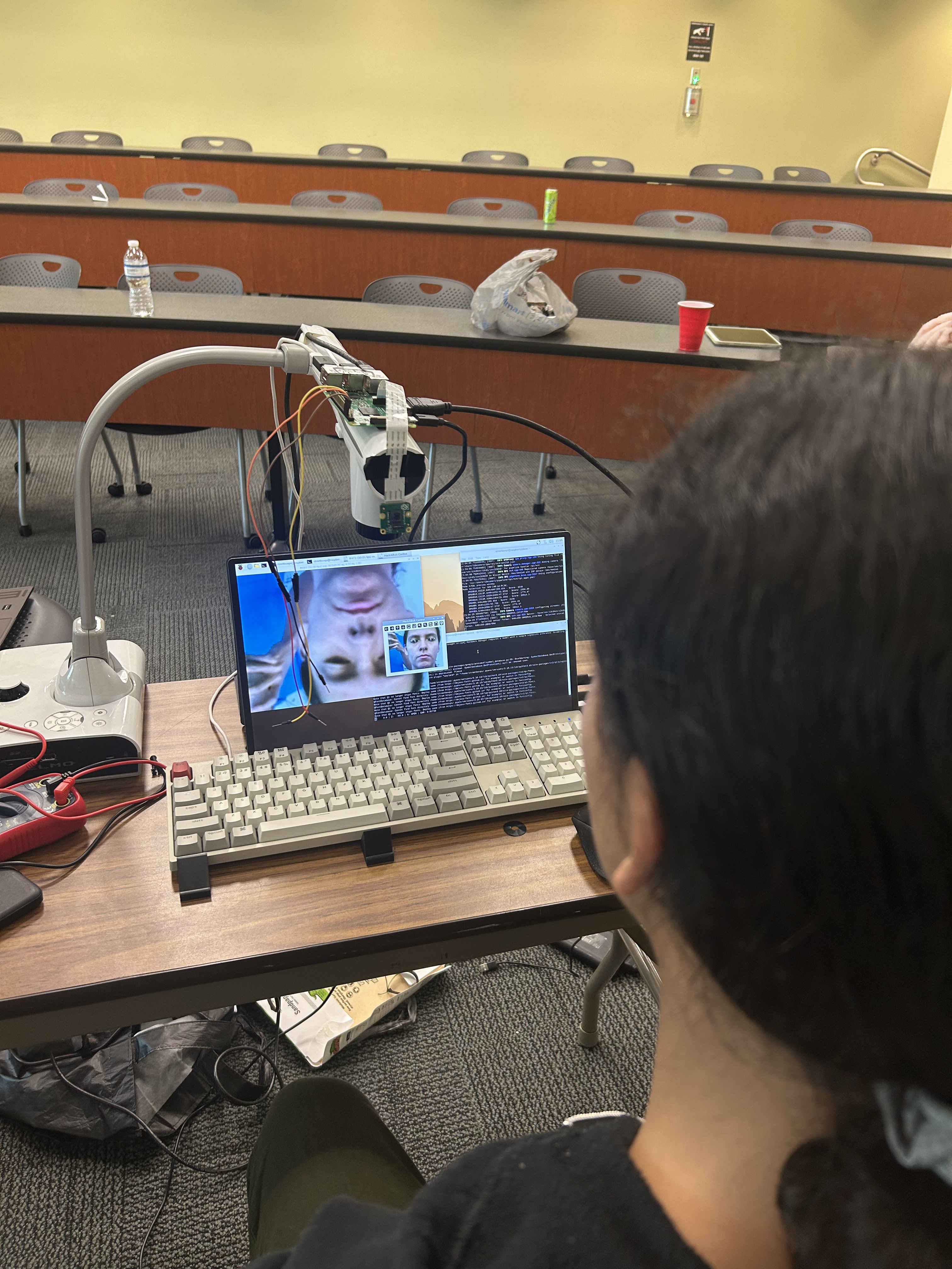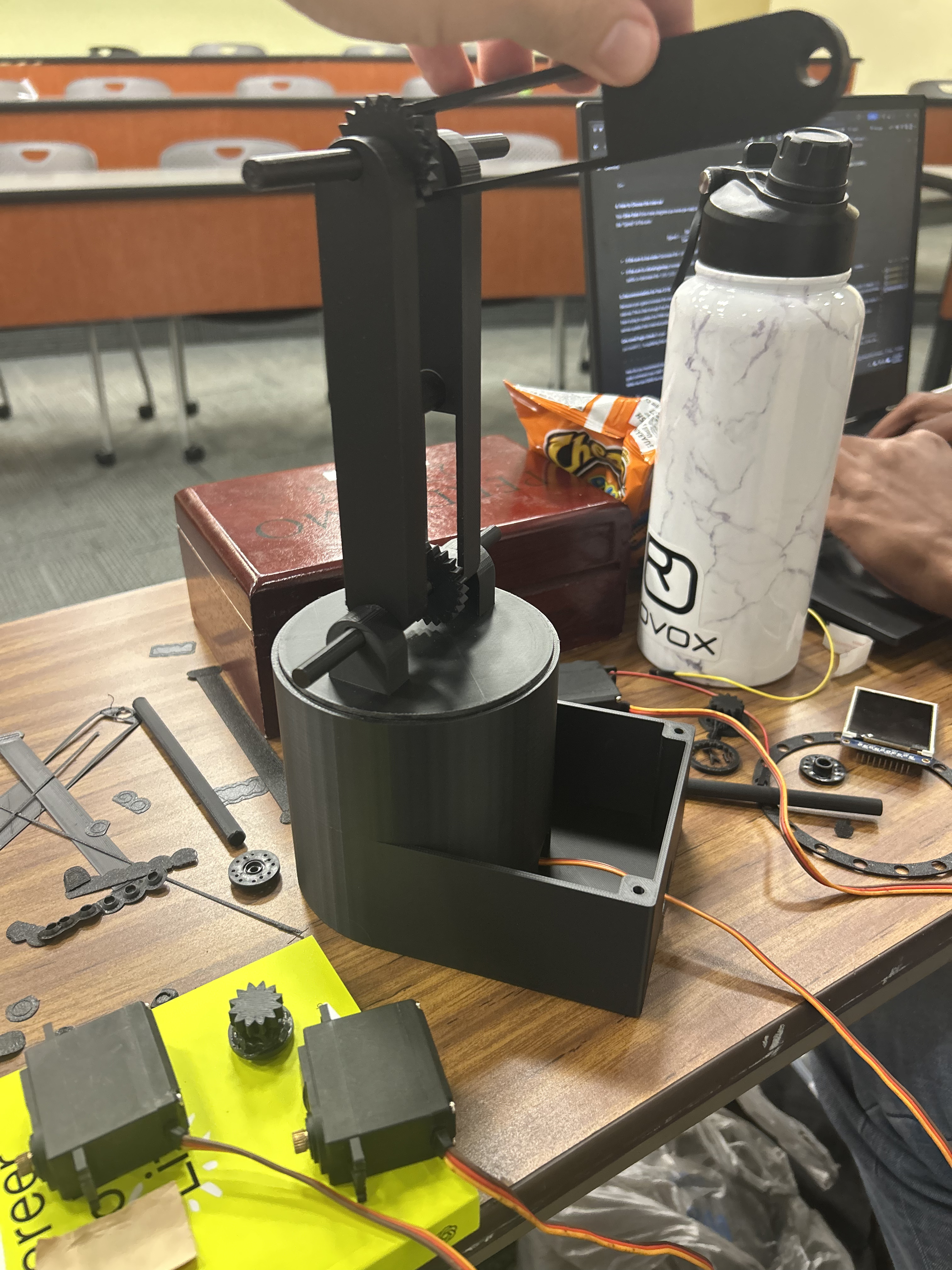The biggest mechanical hurdle was the center gear math. Because the robot is small, determining the optimal gear spacing for smooth rotation was incredibly difficult. The small scale also made the arm significantly top heavy, which threatened the stability of the device. Since we were on a tight deadline, we used a heavy portable charger as a makeshift counterweight to keep the base grounded. On the software side, we had to defeat the droop. Most eye trackers get confused when eyelids move, so we anchored our tracking to the orbital bones of the face to ensure the system remained reliable for users who might be tired or have specific accessibility needs.