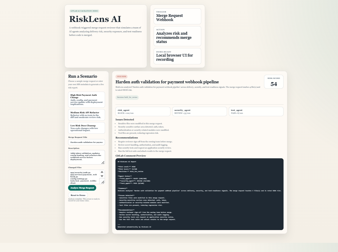 RiskLens AI is an event-driven system that analyzes GitLab merge requests and generates a structured risk report in real time.