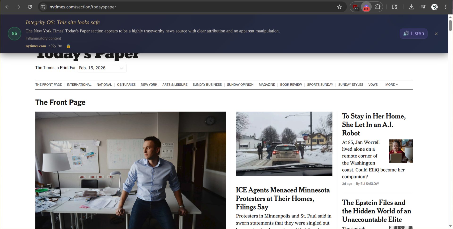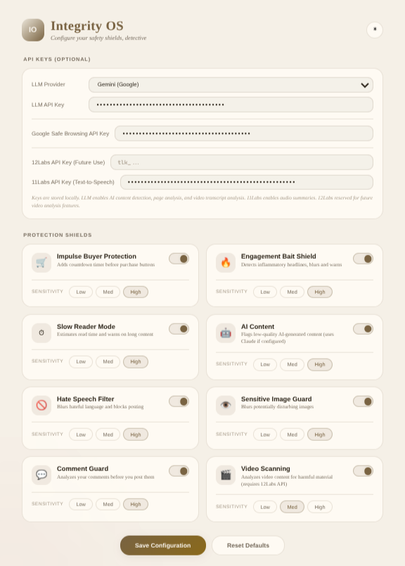 Integrity OS is a browser extension that assigns a real-time trust score to every webpage a user visits using a layered protection system.