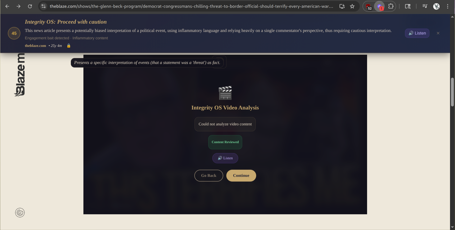 Example of a website being flagged for being very biased and politically leaning while blurring text and providing proper reasoning.