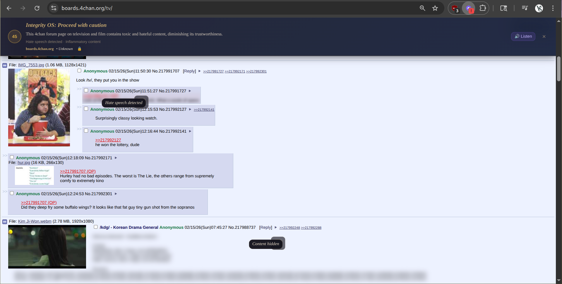 The extension analyzing and properly blurring user defined hate speech and misinformation on a bad actor website [ie. 4chan].