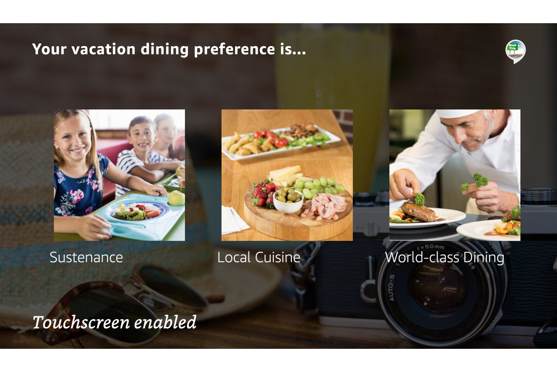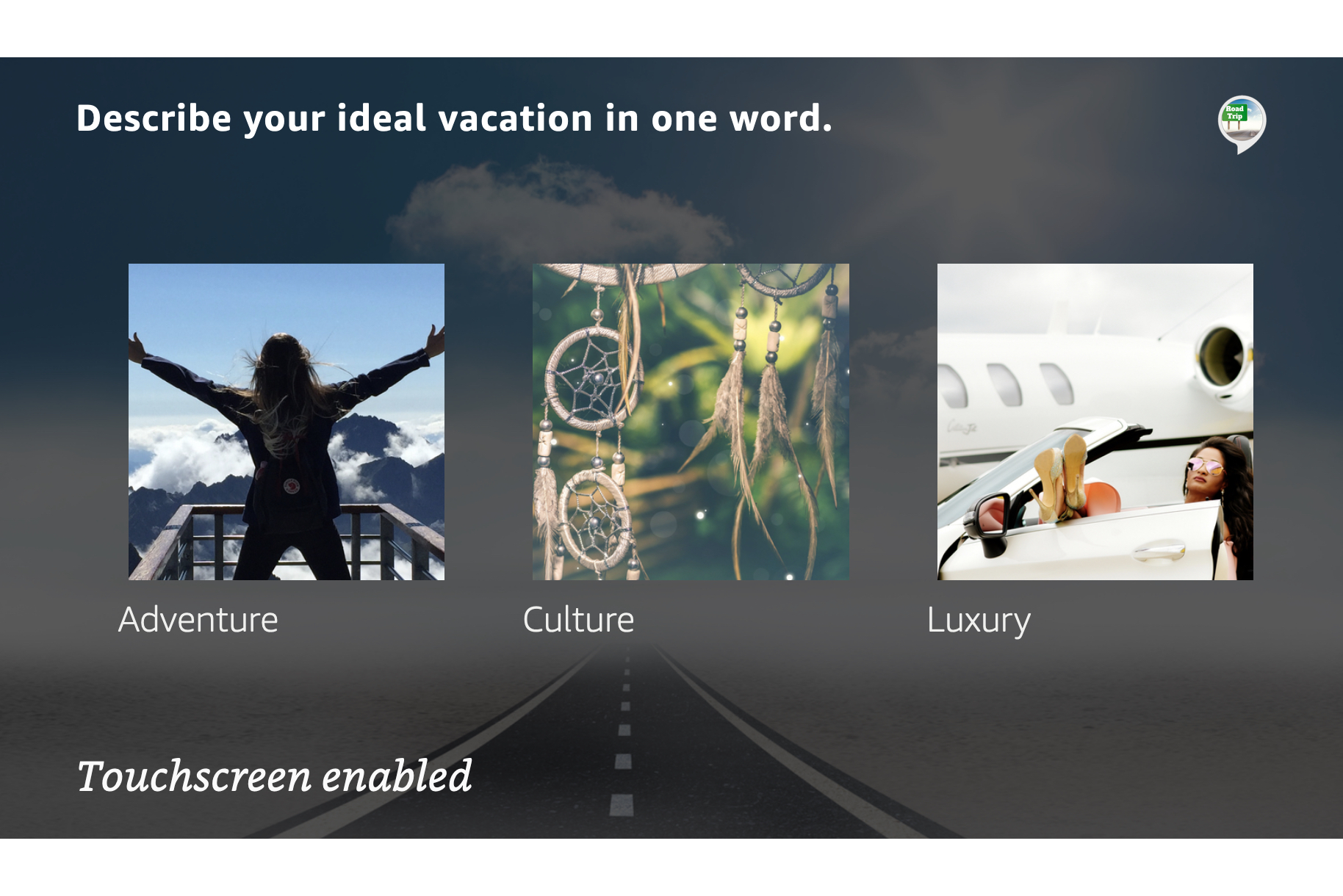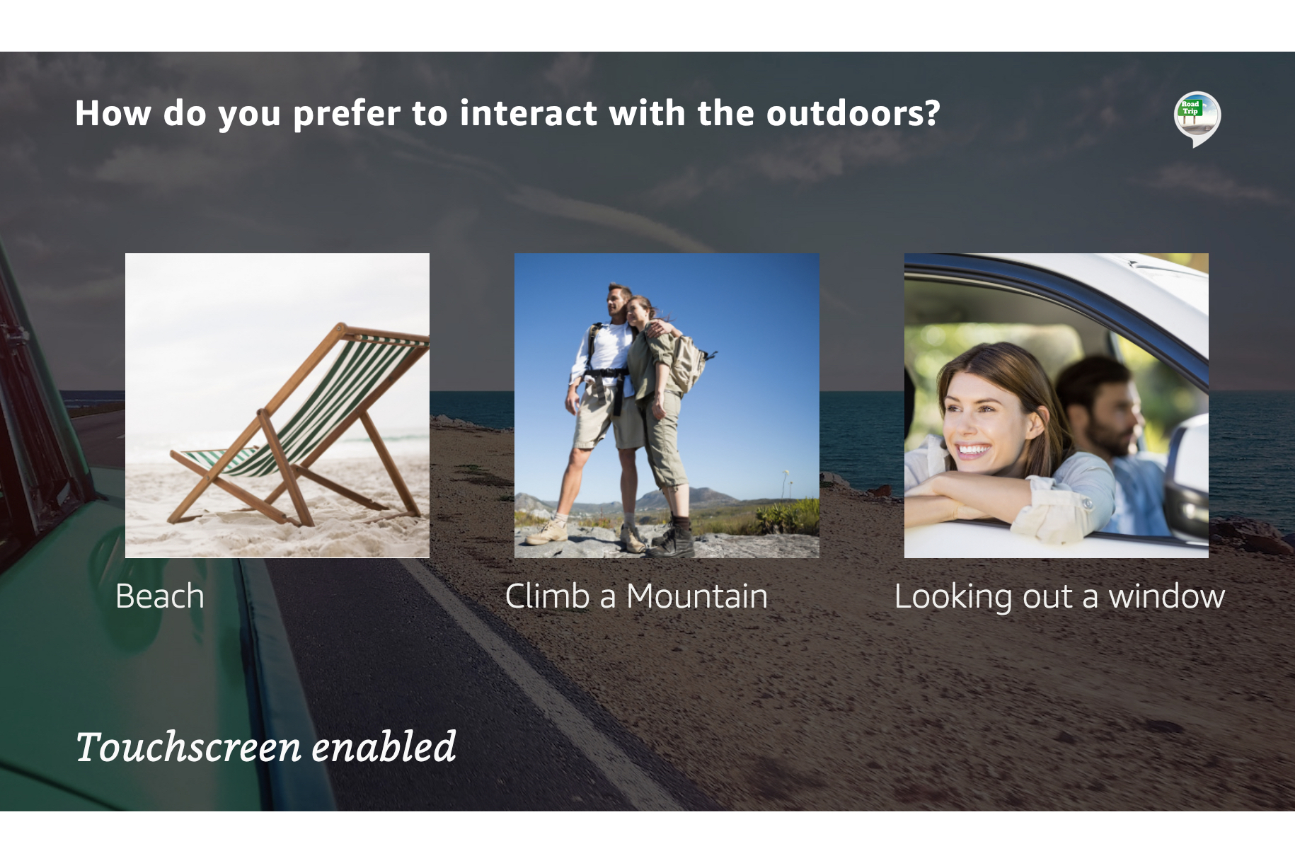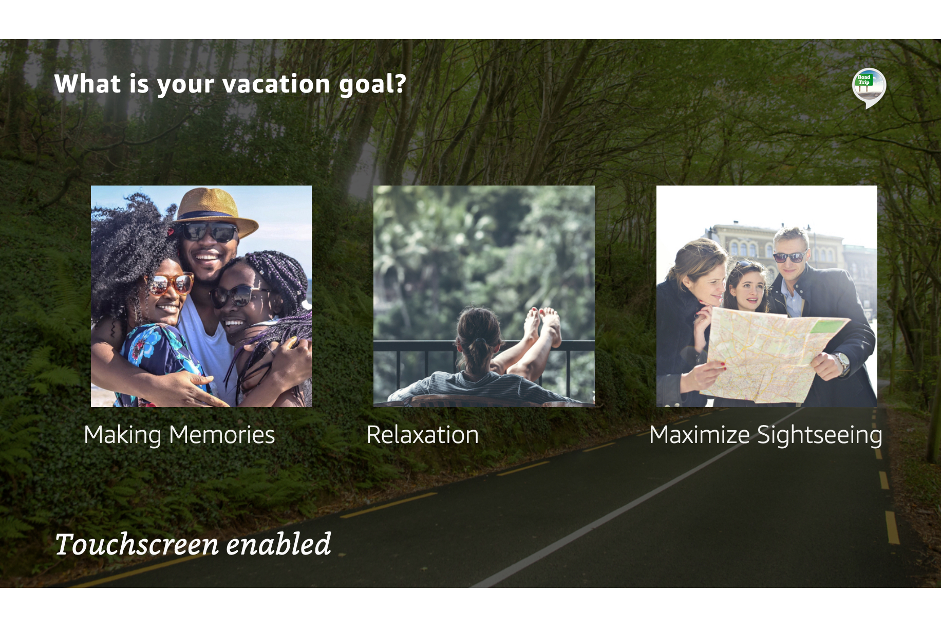 The algorithm returns a suggested vacation destination and the number of driving miles. Echo Show users can make their selections on the touchscreen and Alexa will provide a photo of the suggested vacation location.