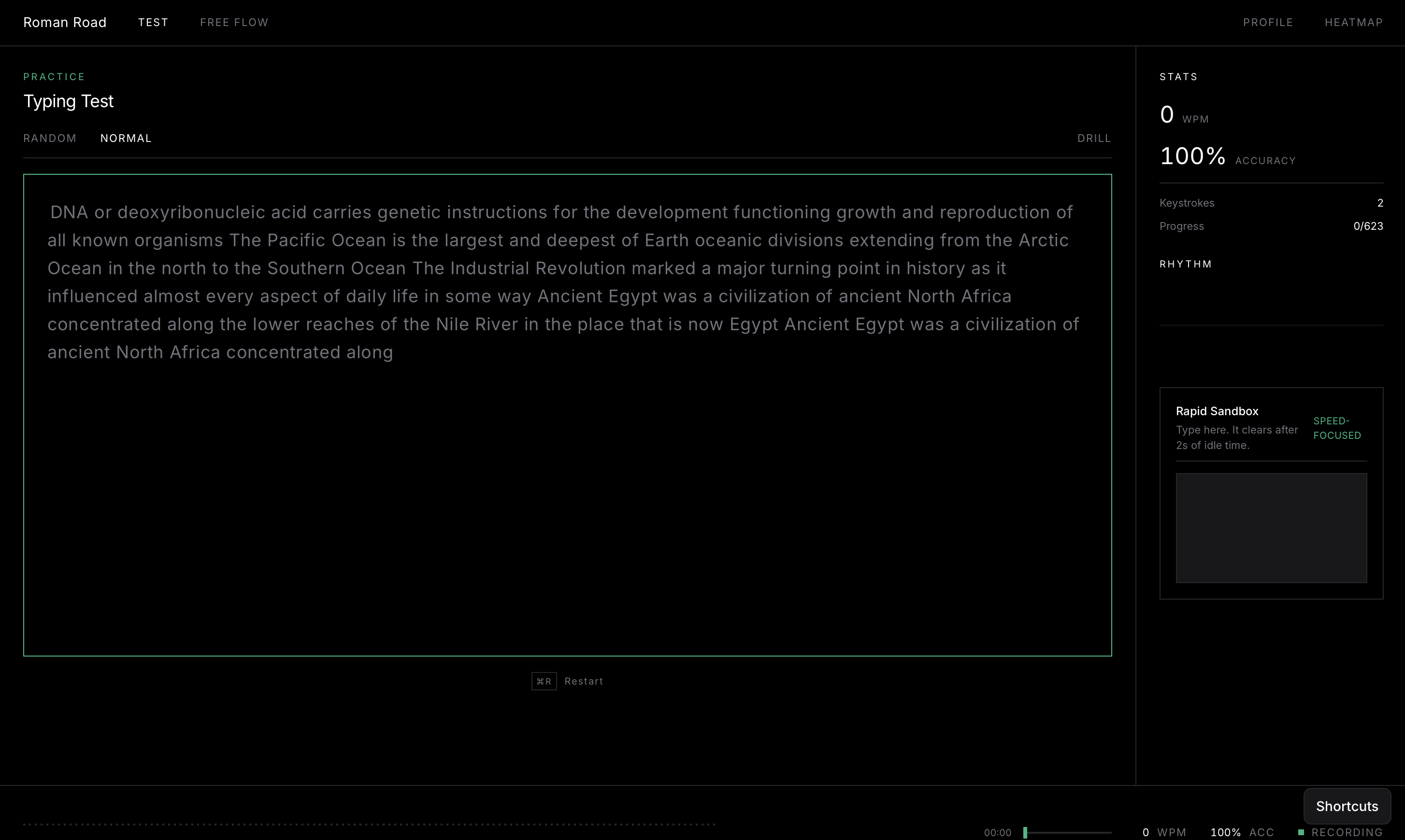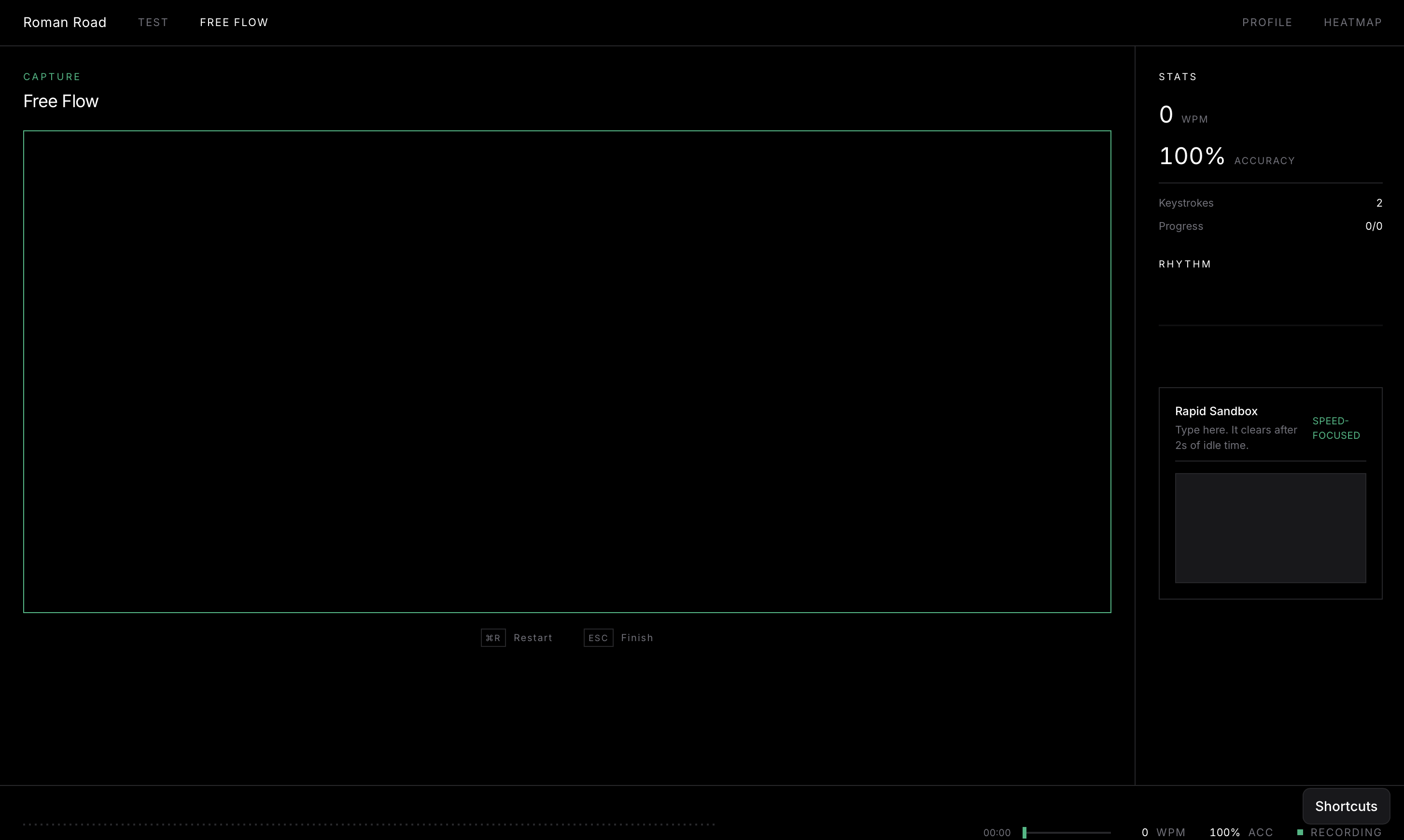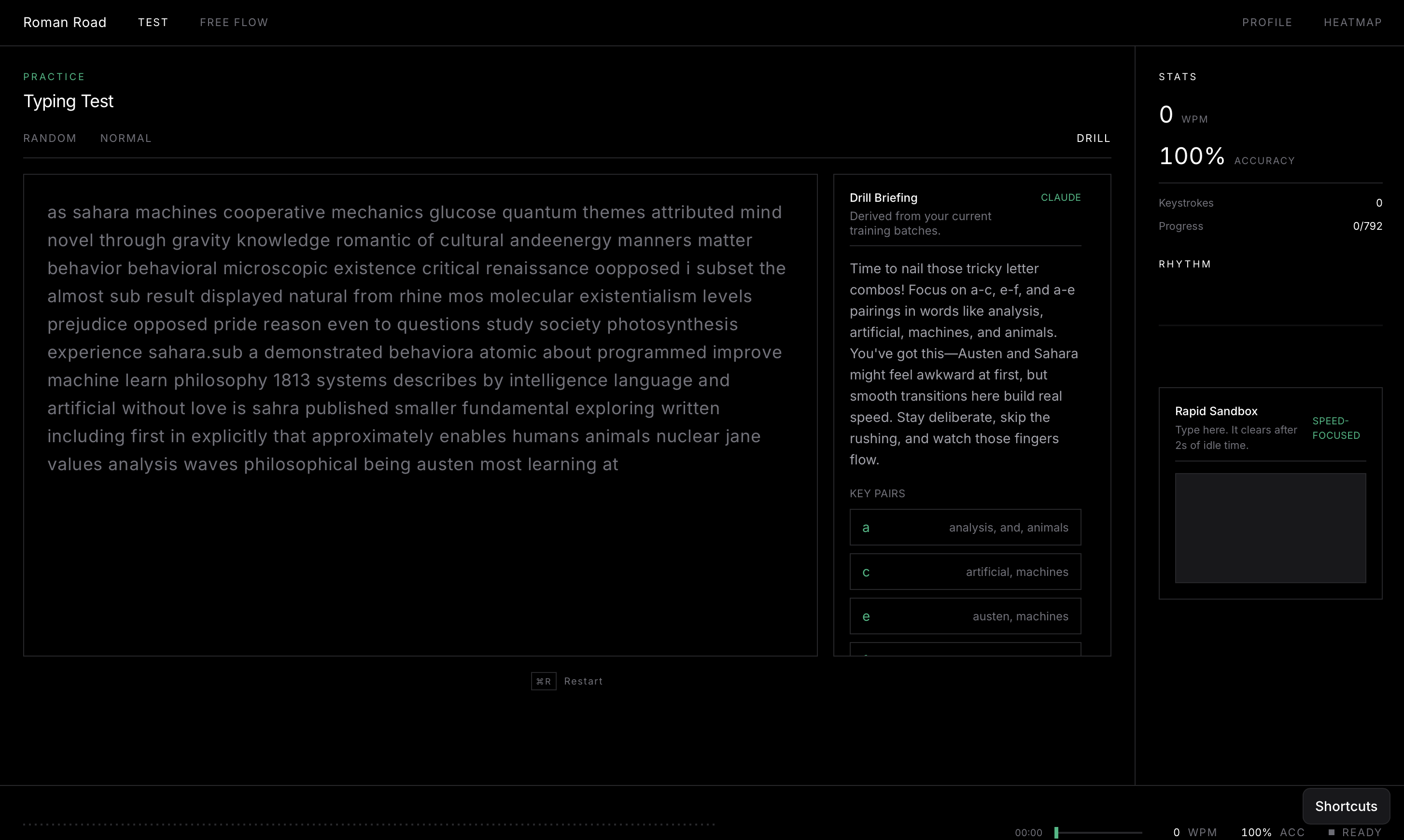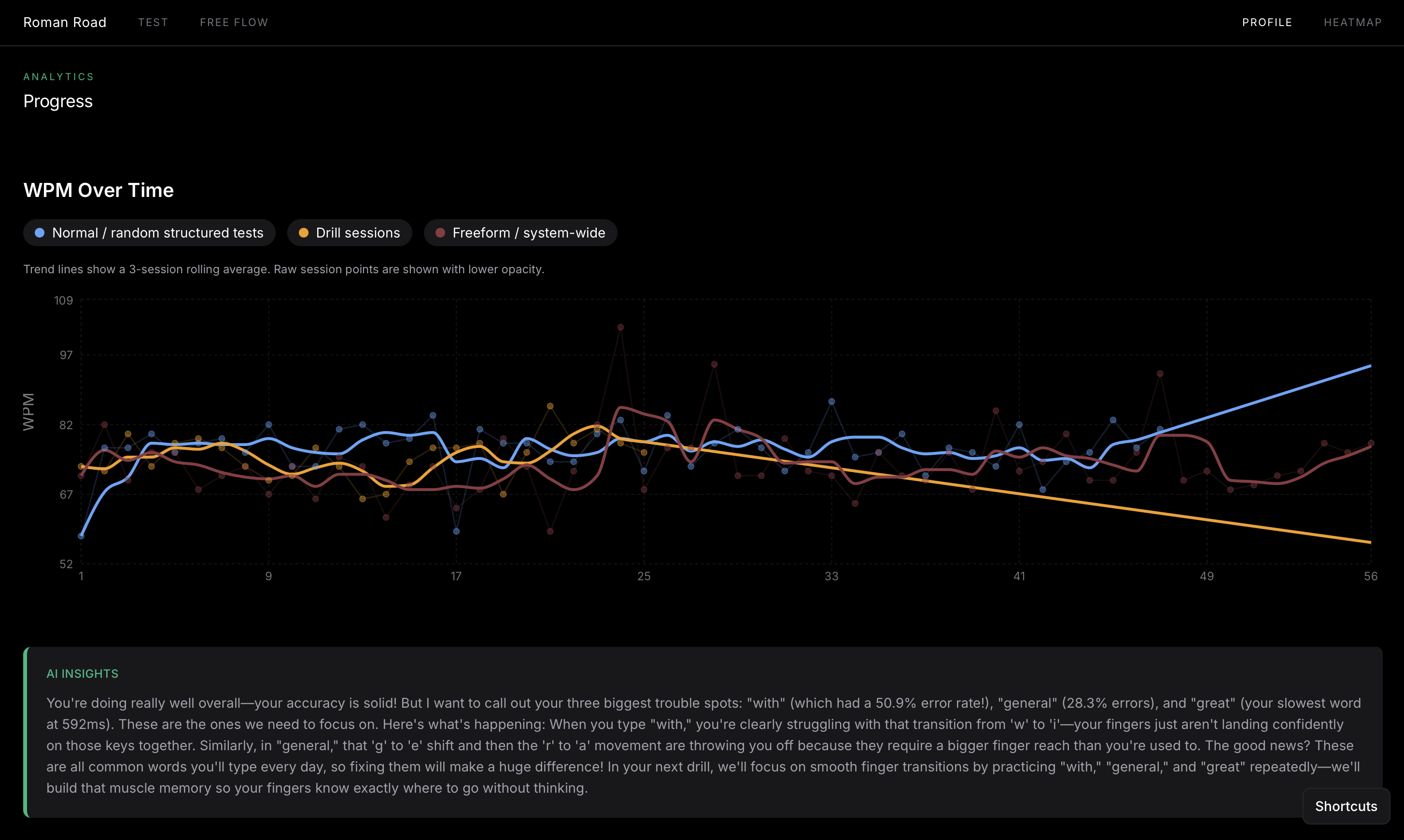 Personally, I genuinely believe in the utility of Roman Road. I will personally be grinding on Roman Road to try and reach a consistently 100+ WPM as a lifetime 75 WPM typer. Furthermore, I want to see just how helpful and intuitive the site can be for those just starting out typing, as well as whether it can help break plateus for those typers who are already very proficient. Roman Road's potential doesn't stop at individual users either. In professional settings where writing speed and accuracy directly affect output, such as software engineers, writers, data entry, and those in legal work--Roman Road could be deployed at an organizational level, aggregating weak points across teams to inform targeted training. The passive keystroke collection means onboarding requires almost no friction. People just work, and Roman Road works in the background. Fewer slowdowns, more output, and a workforce that actually improves over time rather than just getting used to being slow.