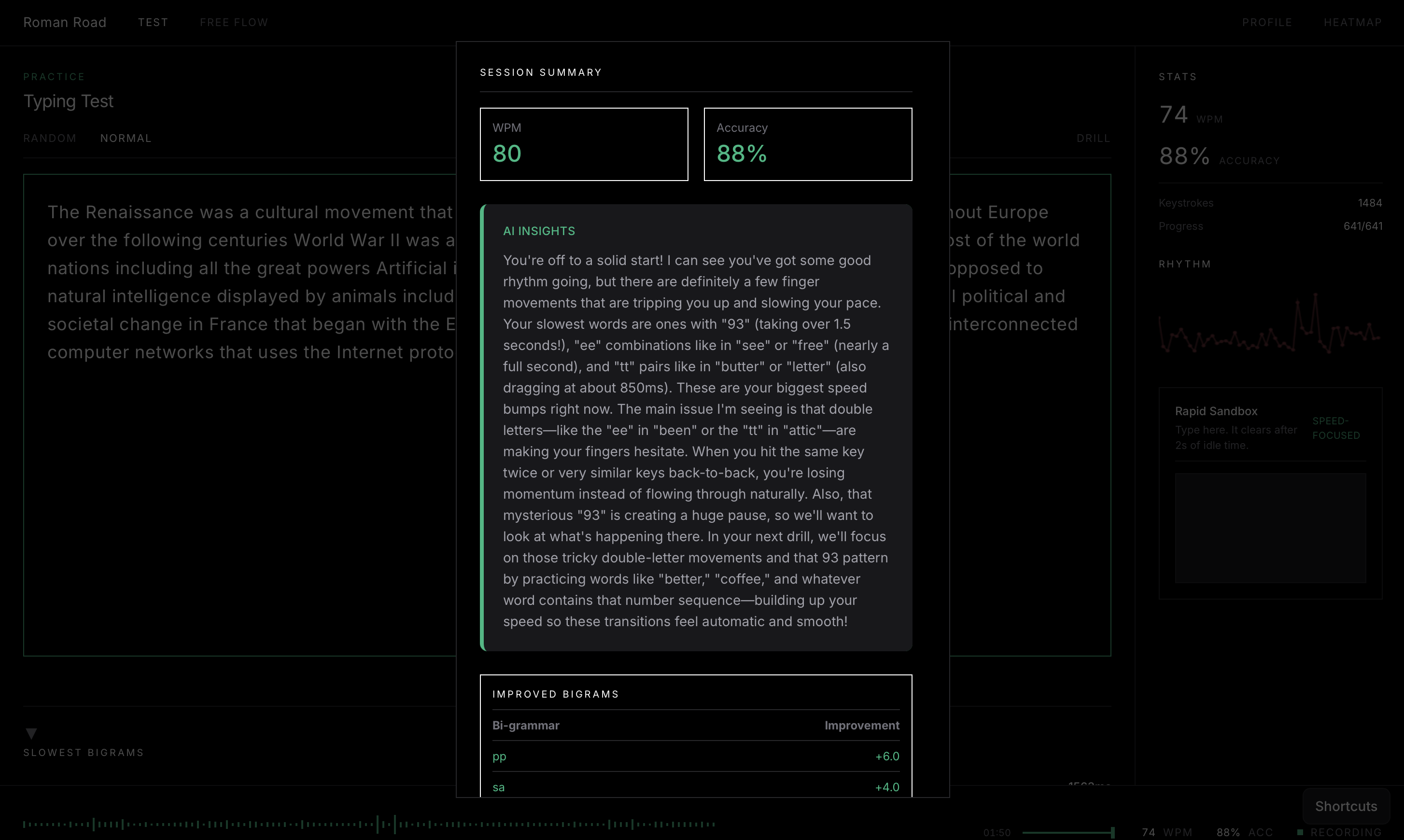 Roman Road is the most attentive typing tutor on the internet. Mainstream competitors like Monkeytype don't serve the functional purpose of making you a better typer in the real world. This is because they cherry pick a word database that is purposefully easier than normal writing, inflating numbers significantly. Some other sites include more complex words but don't offer anything beyond that. Roman Road pays attention to minute details, including which words are typically performed poorly on by the user, but also which bigrams (two letter combinations) tend to have the most latency. Using this data, Roman Road provides drills that specifically target these weak points with words the user has historically struggled with, as well as words generated from batches containing their weakest bigrams. By focusing on personalized pain points in typing, we made sure that users would experience a leveling in their general typing ability rather than a few shiny "personal fastest WPMs." Just like how potholes cause hiccups and traffic on roads, we realized that these "potholes" of difficult words should be prioritized in order to firstly make the user typing experience as smooth as possible, to facilitate incremental increases in overall speed as time passes.