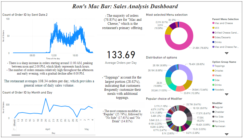 The dashboard tracks and visualizes essential sales metrics, including: Order Volume: Displays the count of orders by time of day and by date. Menu Preferences: Highlights which menu items are most popular, with a breakdown by category. Modifiers: Shows how often customers customize their orders with toppings, drizzles, or other options. Daily Average Orders: Provides a quick snapshot of the average number of orders per day. This allows Ron's Mac Bar to identify peak hours, popular menu items, and customization trends.