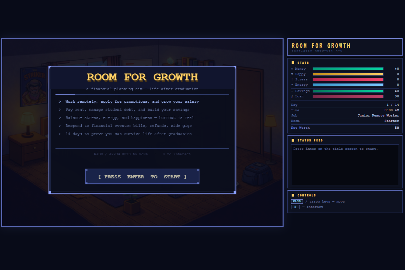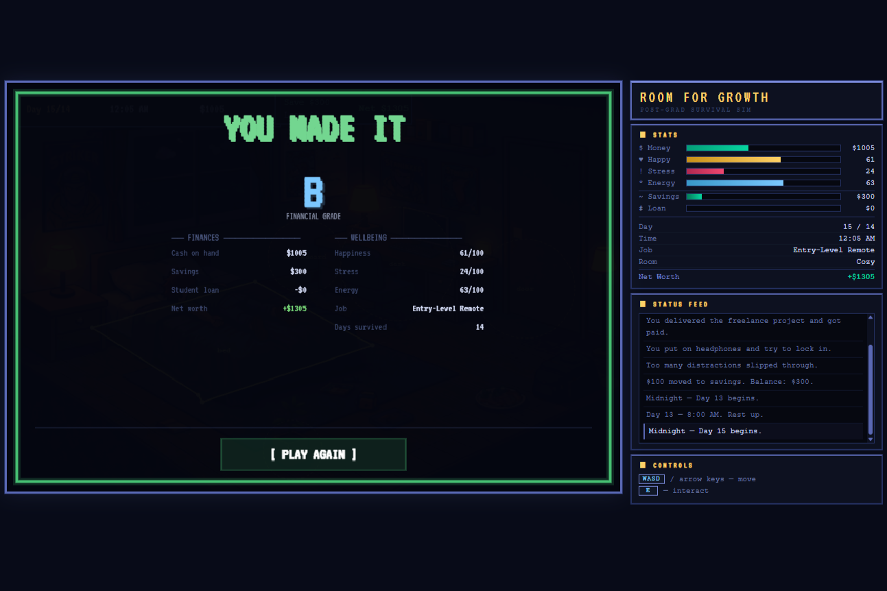 Players must live through a 14-day period where they must balance money, happiness, energy, and stress, trying their best to manage each one to prevent spiraling out. The player moves around their room, interacting with objects to trigger decisions or minigames such as staying focused at work, guiding dreams while sleeping, making smart grocery decisions under pressure, avoiding negative effects of mindless scrolling, applying for better jobs through decision challenges, and socializing through time/rhythm-based interactions. Each action affects both short-term survival and long-term outcomes, including savings, debt, and overall well-being.