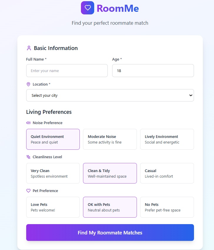 RoomMe lets users fill out a short form with basic lifestyle preferences — like noise level, cleanliness, pets, and location — and then shows them a ranked list of compatible roommates in the same city. It filters out incompatible matches and makes it easy to focus on people you’re most likely to get along with.