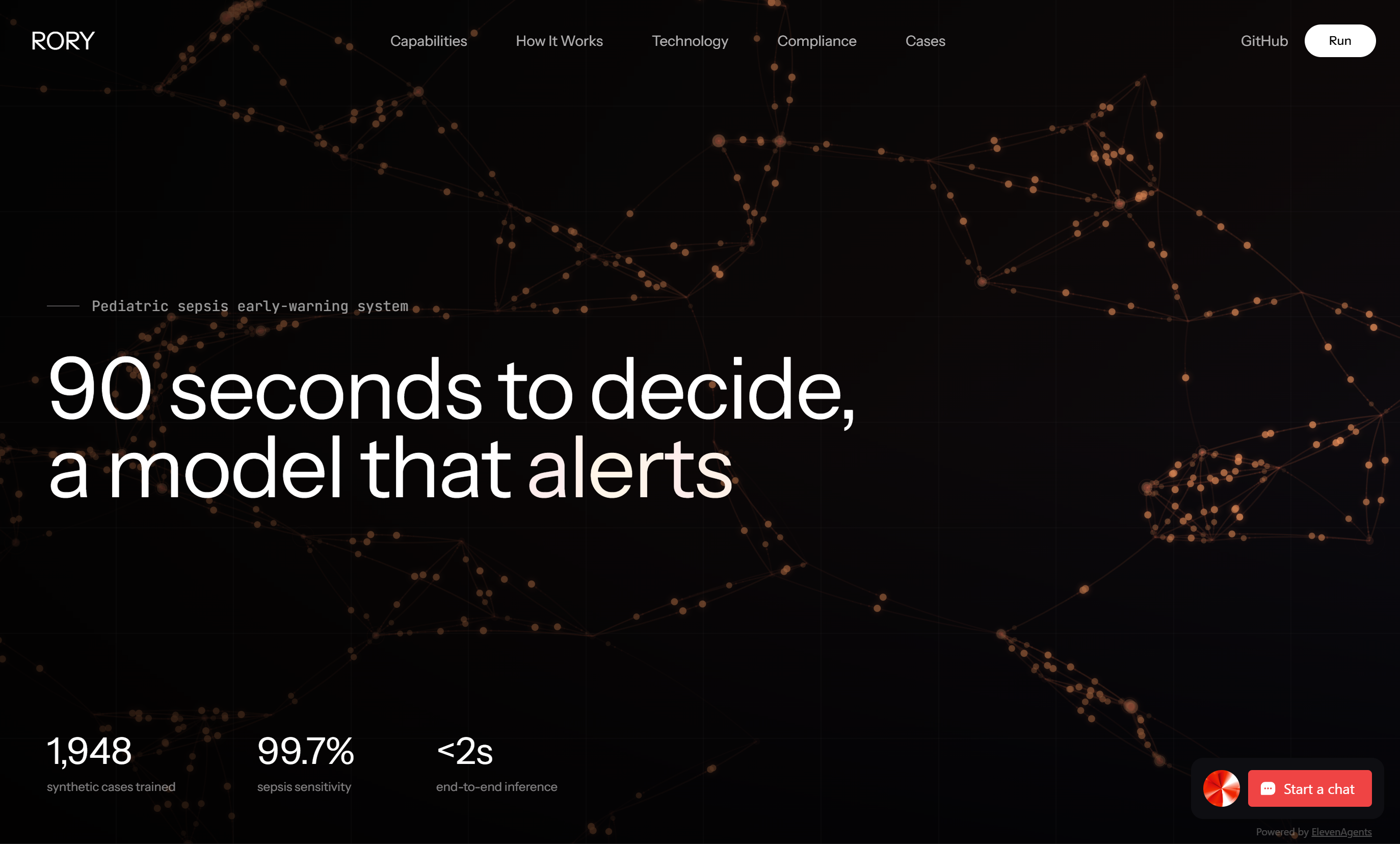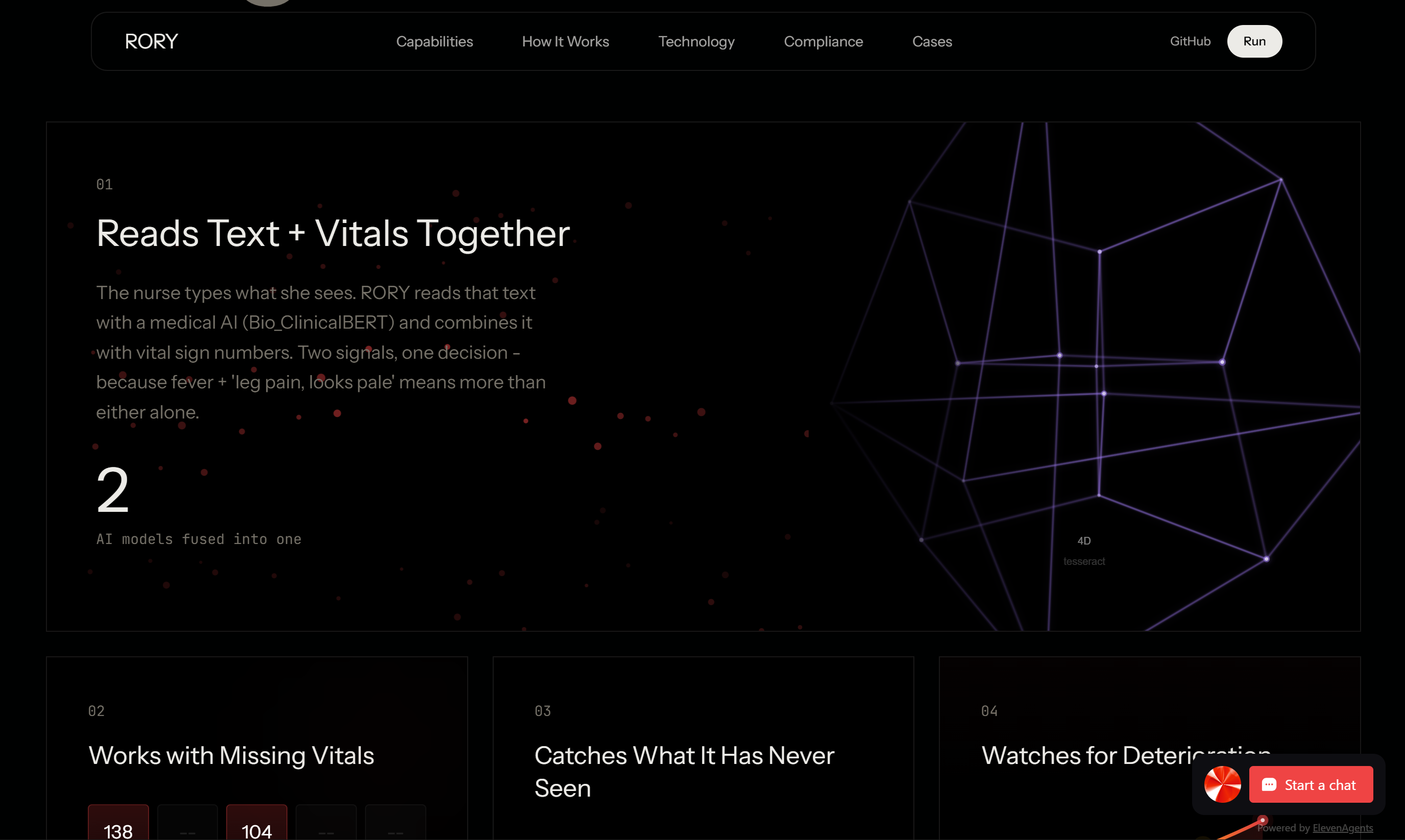 - Works with missing vitals. School nurse only has a thermometer and pulse? RORY still works. It adapts to whatever data is available and tells you exactly how confident it is.